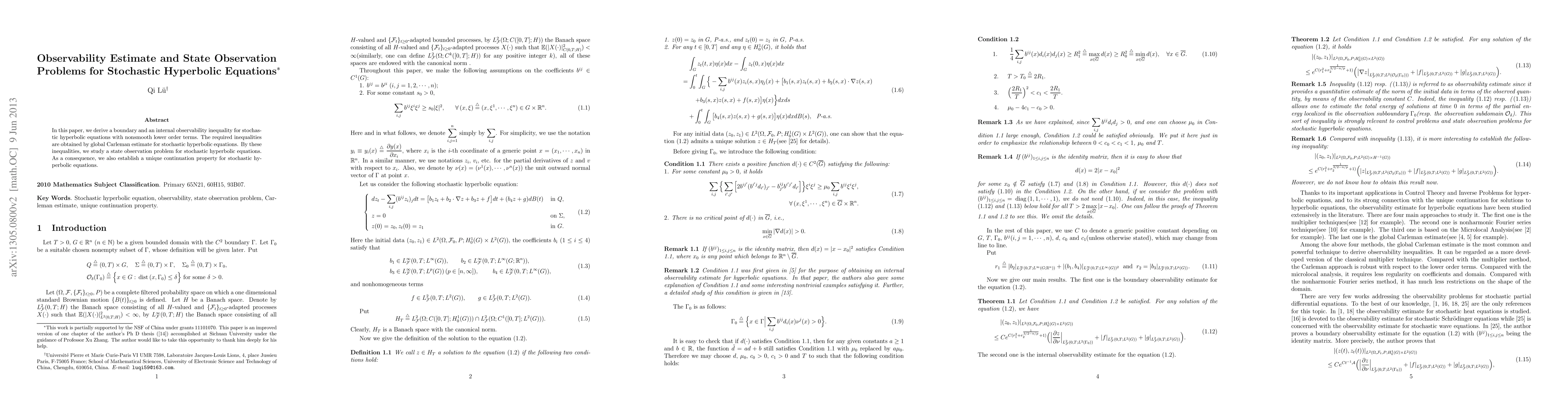 This paper derives boundary and internal observability inequalities for stochastic hyperbolic equations using global Carleman estimates, and utilizes these inequalities to study state observation problems and establish a unique continuation property for such equations.