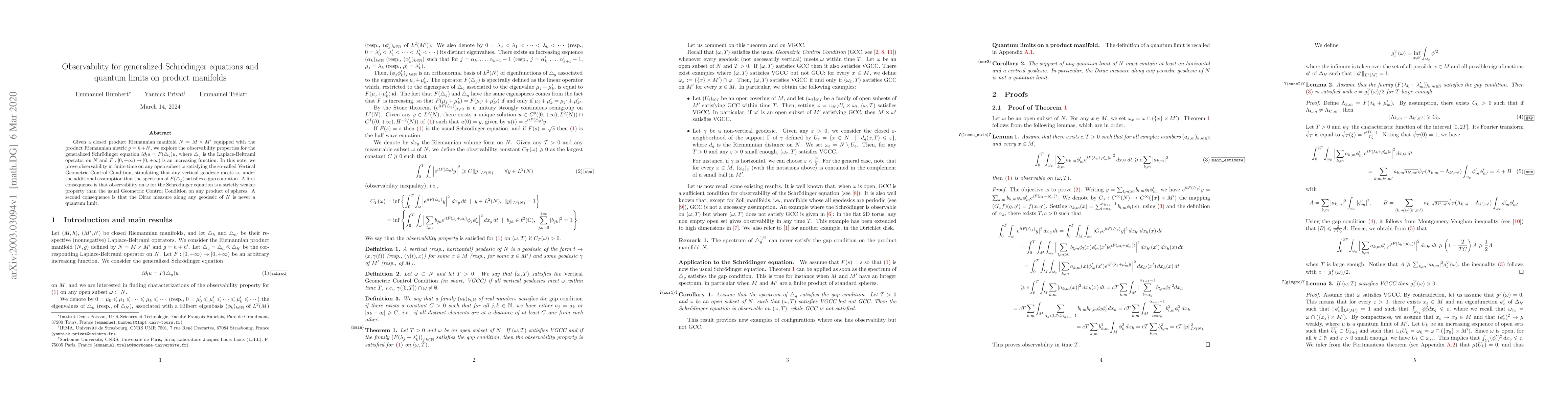 Given a closed product Riemannian manifold N = M x M equipped with the product Riemannian metric g = h + h , we explore the observability properties for the generalized Schr{\"o}dinger equation i$\partial$ t u = F (g)u, where g is the Laplace-Beltrami operator on N and F : [0, +$\infty$) $\rightarrow$ [0, +$\infty$) is an increasing function. In this note, we prove observability in finite time on any open subset $\omega$ satisfying the so-called Vertical Geometric Control Condition, stipulating that any vertical geodesic meets $\omega$, under the additional assumption that the spectrum of F (g) satisfies a gap condition. A first consequence is that observability on $\omega$ for the Schr{\"o}dinger equation is a strictly weaker property than the usual Geometric Control Condition on any product of spheres. A second consequence is that the Dirac measure along any geodesic of N is never a quantum limit.