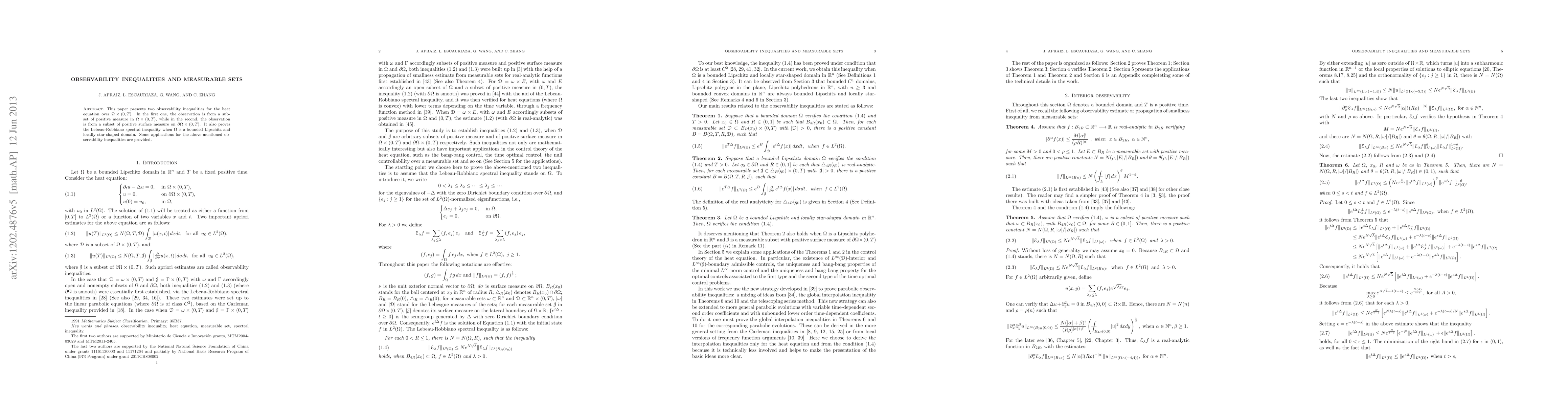 This paper establishes two observability inequalities for the heat equation, one for observations from a measurable set in $\Omega\times(0,T)$ and another for observations on the boundary $\partial\Omega\times(0,T)$. It also proves the Lebeau-Robbiano spectral inequality for bounded Lipschitz domains and discusses applications of these inequalities.