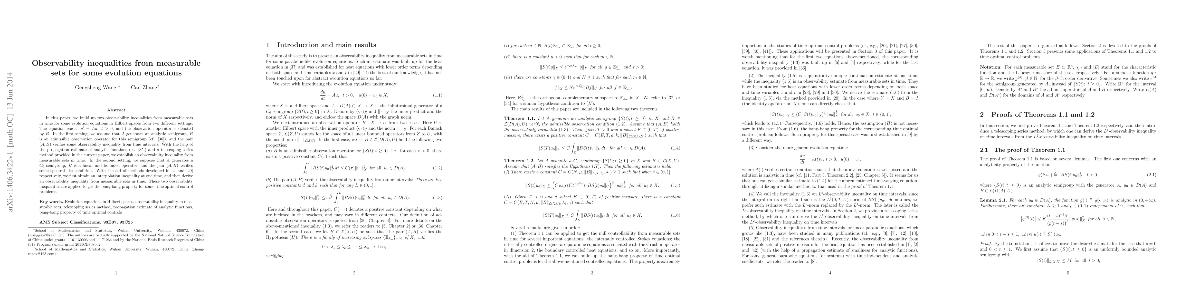 In this paper, we build up two observability inequalities from measurable sets in time for some evolution equations in Hilbert spaces from two different settings. The equation reads: $u'=Au,\; t>0$, and the observation operator is denoted by $B$. In the first setting, we assume that $A$ generates an analytic semigroup, $B$ is an admissible observation operator for this semigroup (cf. \cite{TG}), and the pair $(A,B)$ verifies some observability inequality from time intervals. With the help of the propagation estimate of analytic functions (cf. \cite{V}) and a telescoping series method provided in the current paper, we establish an observability inequality from measurable sets in time. In the second setting, we suppose that $A$ generates a $C_0$ semigroup, $B$ is a linear and bounded operator, and the pair $(A, B)$ verifies some spectral-like condition. With the aid of methods developed in \cite{AEWZ} and \cite{PW2} respectively, we first obtain an interpolation inequality at one time, and then derive an observability inequality from measurable sets in time. These two observability inequalities are applied to get the bang-bang property for some time optimal control problems.