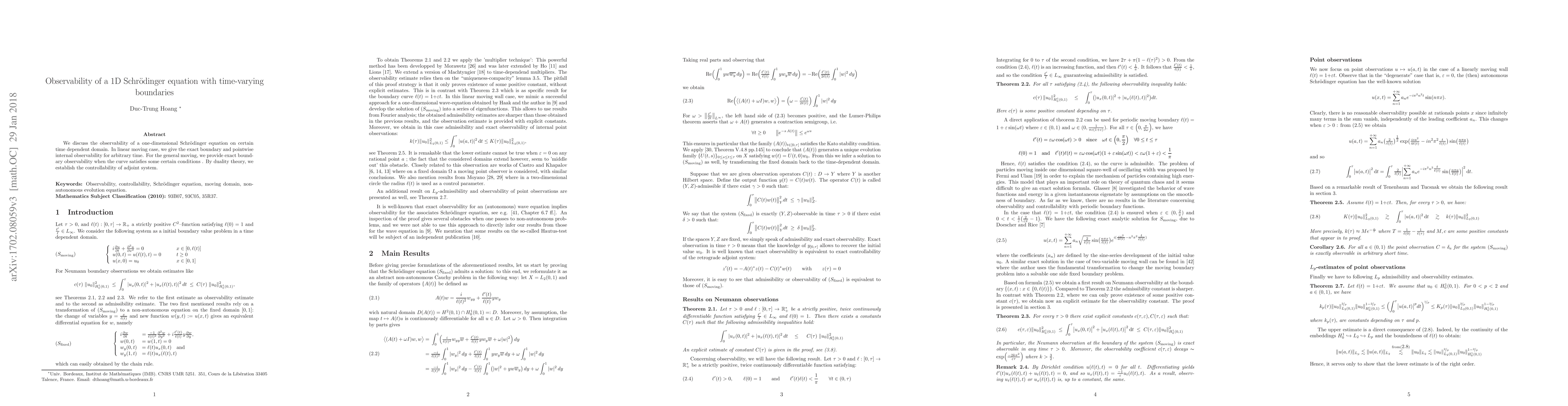 This paper explores the observability of a 1D Schrödinger equation with time-varying boundaries, providing exact boundary and pointwise internal observability for linear moving domains. It also establishes exact boundary observability for general moving domains under specific conditions and proves the controllability of the adjoint system via duality theory.