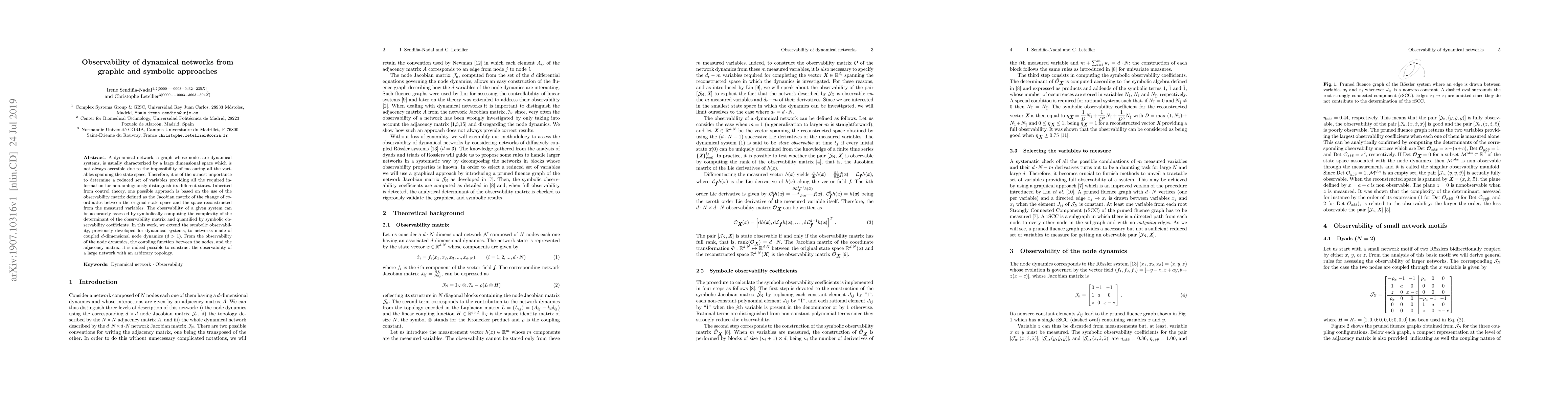 This paper explores the observability of dynamical networks using both graphic and symbolic approaches, extending symbolic observability to networks with coupled node dynamics. It constructs the observability of large networks by combining node dynamics observability, coupling functions, and the adjacency matrix.