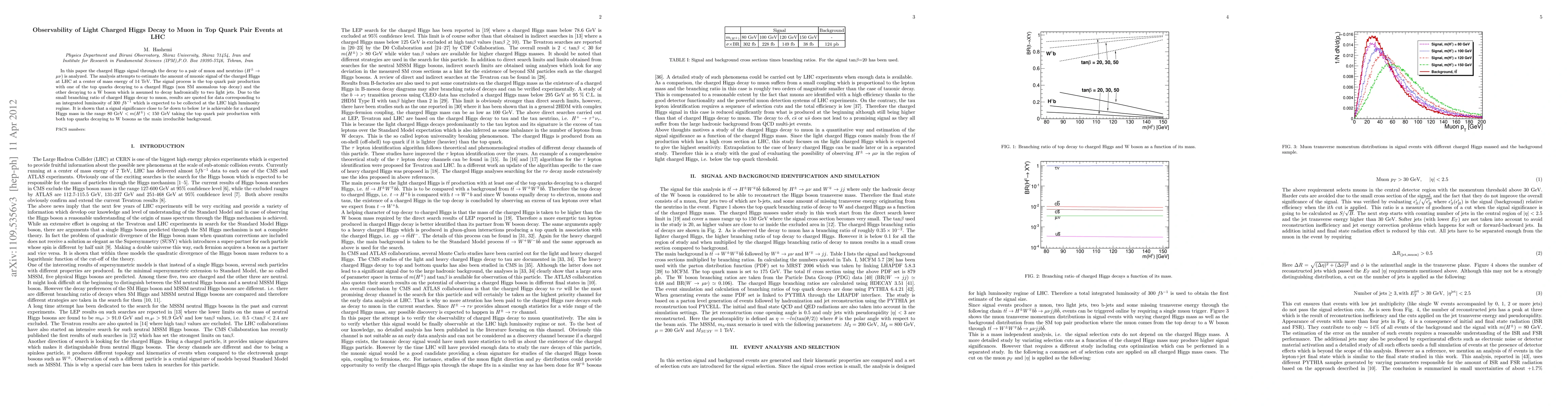 In this paper the charged Higgs signal through the decay to a pair of muon and neutrino (H -> mu nu) is analyzed. The analysis attempts to estimate the amount of muonic signal of the charged Higgs at LHC at a center of mass energy of 14 TeV. The signal process is the top quark pair production with one of the top quarks decaying to a charged Higgs (non SM anomalous top quark decay) and the other decaying to a W boson which is assumed to decay hadronically to two light jets. Due to the small branching ratio of charged Higgs decay to muon, results are quoted for data corresponding to an integrated luminosity of 300 fb^-1 which is expected to be collected at the LHC high luminosity regime. It is shown that a signal significance close to 5 down to below 1 is achievable for a charged Higgs mass in the range 80 GeV < m(H \pm) < 150 GeV taking the top quark pair production with both top quarks decaying to W bosons as the main irreducible background.