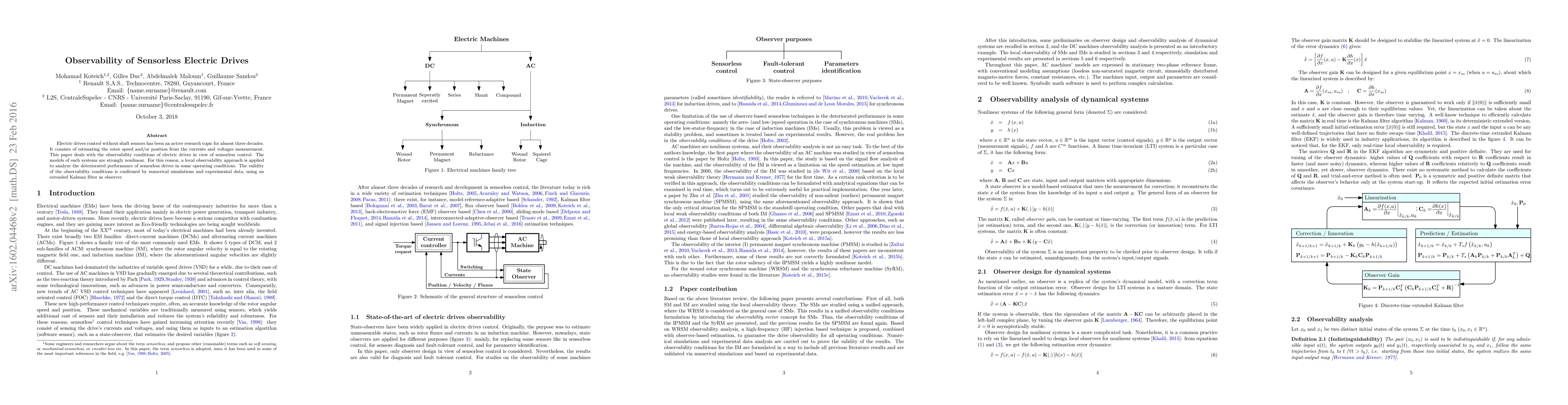 This paper investigates the observability conditions for sensorless control in electric drives, focusing on estimating rotor speed and position from current and voltage measurements. It employs a local observability approach to analyze performance degradation and validates the findings through numerical simulations and experimental data using an extended Kalman filter.