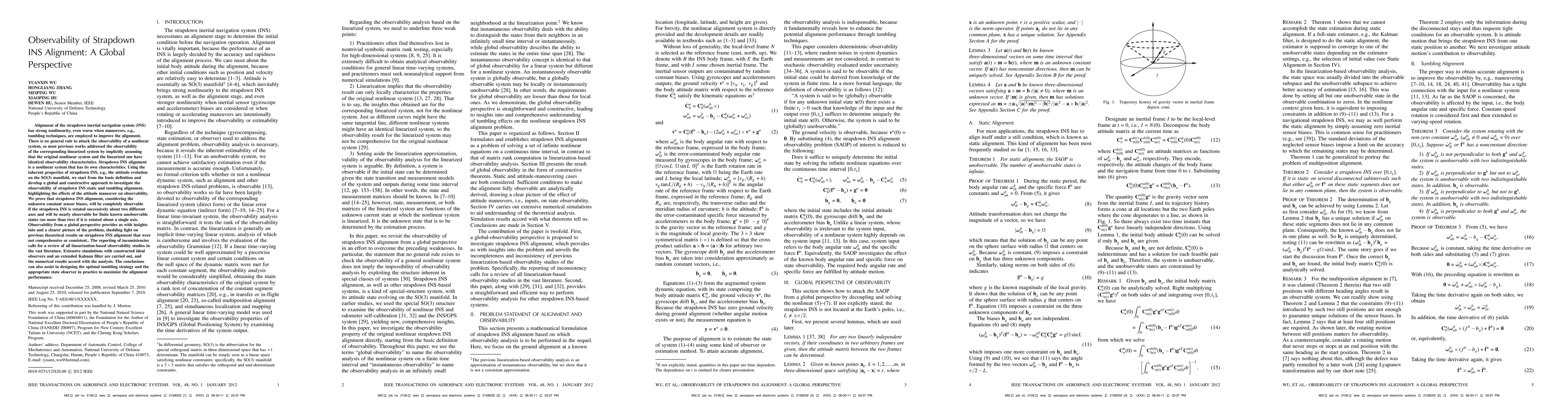 This paper develops a global approach to investigate the observability of strapdown inertial navigation system (INS) alignment, emphasizing the effects of attitude maneuvers. It proves that INS alignment is completely observable with two-axis rotations and nearly observable with a single-axis rotation, challenging previous linearization-based studies. The findings provide insights into INS alignment and guide practical design of optimal tumbling strategies and state observers.