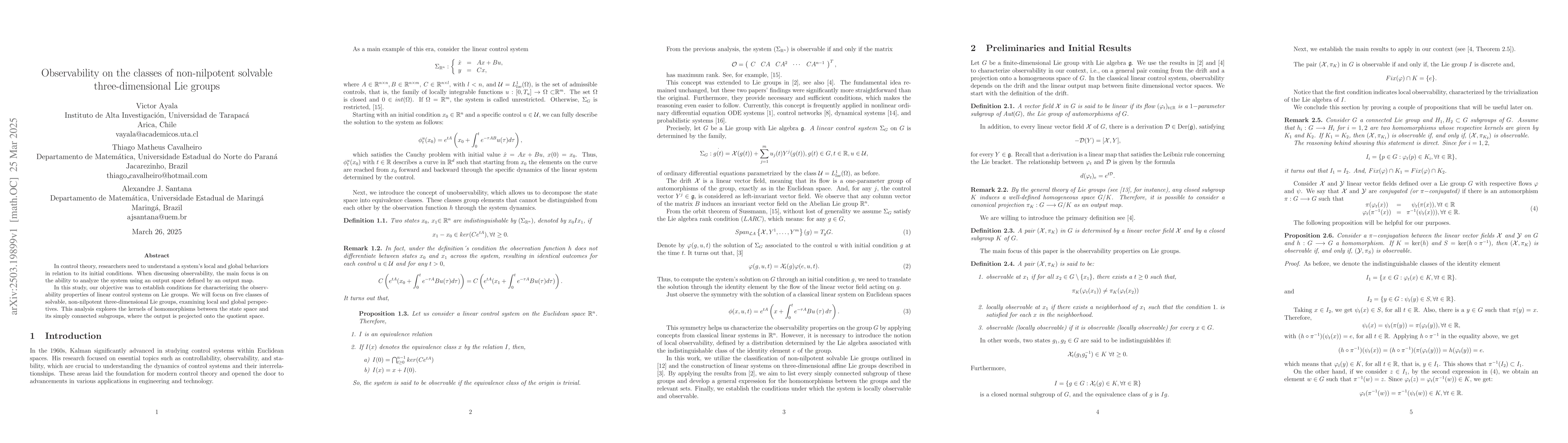 The paper presents a comprehensive observability analysis framework for specific classes of three-dimensional solvable, non-nilpotent Lie groups, utilizing homomorphism kernels and projections onto quotient spaces.