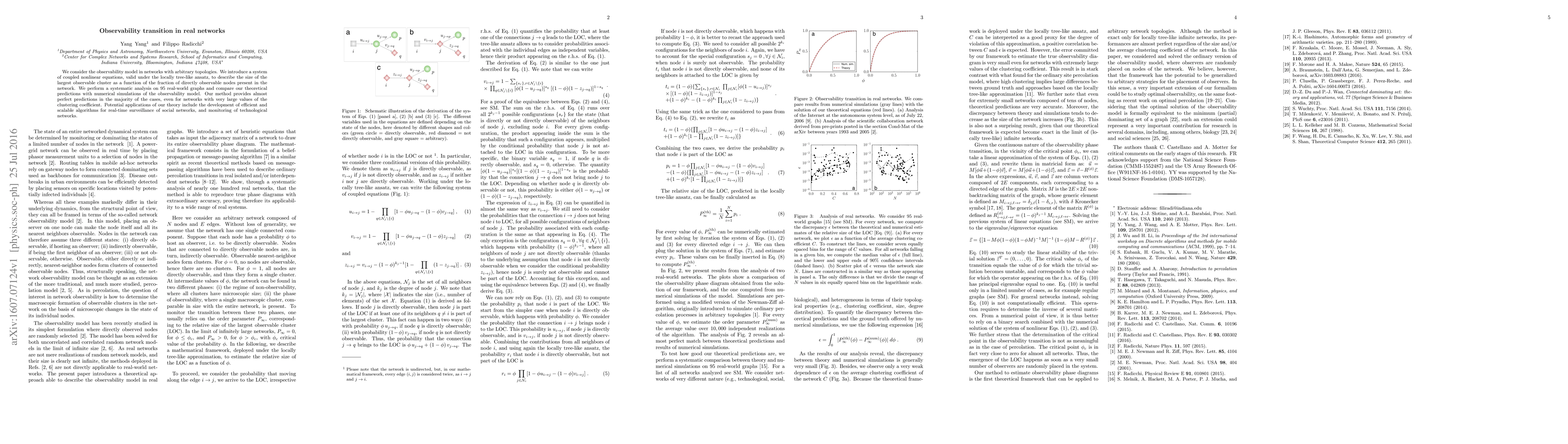 We consider the observability model in networks with arbitrary topologies. We introduce a system of coupled nonlinear equations, valid under the locally tree-like ansatz, to describe the size of the largest observable cluster as a function of the fraction of directly observable nodes present in the network. We perform a systematic analysis on 95 real-world graphs and compare our theoretical predictions with numerical simulations of the observability model. Our method provides almost perfect predictions in the majority of the cases, even for networks with very large values of the clustering coefficient. Potential applications of our theory include the development of efficient and scalable algorithms for real-time surveillance of social networks, and monitoring of technological networks.