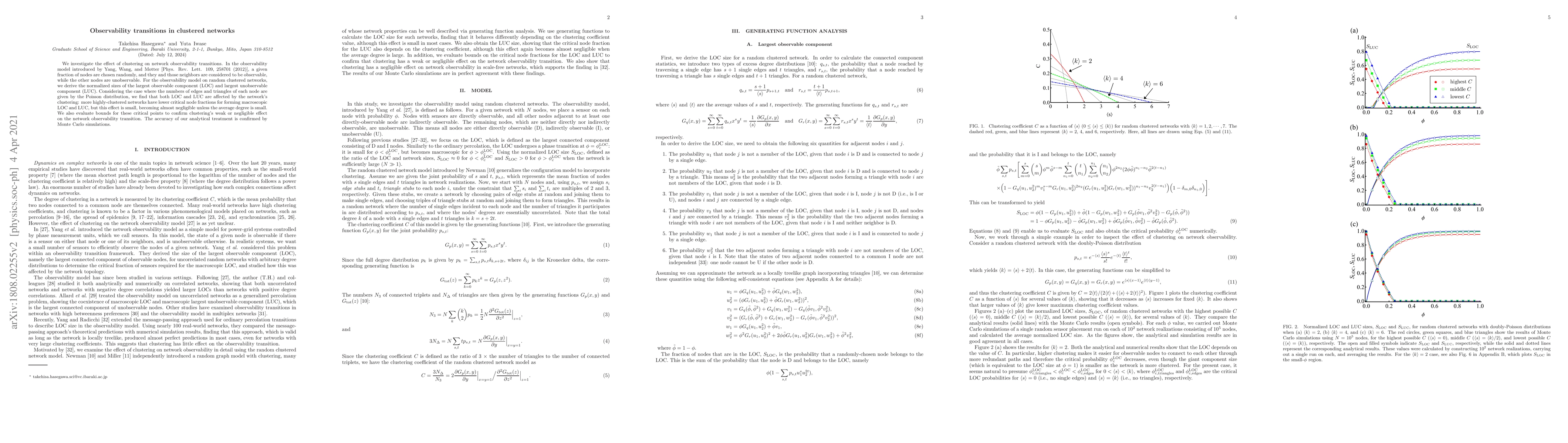 This paper explores how clustering influences network observability transitions in clustered networks, finding that while higher clustering slightly lowers critical node fractions for observable components, this effect is minimal unless the average degree is low. Analytical results are validated by Monte Carlo simulations.