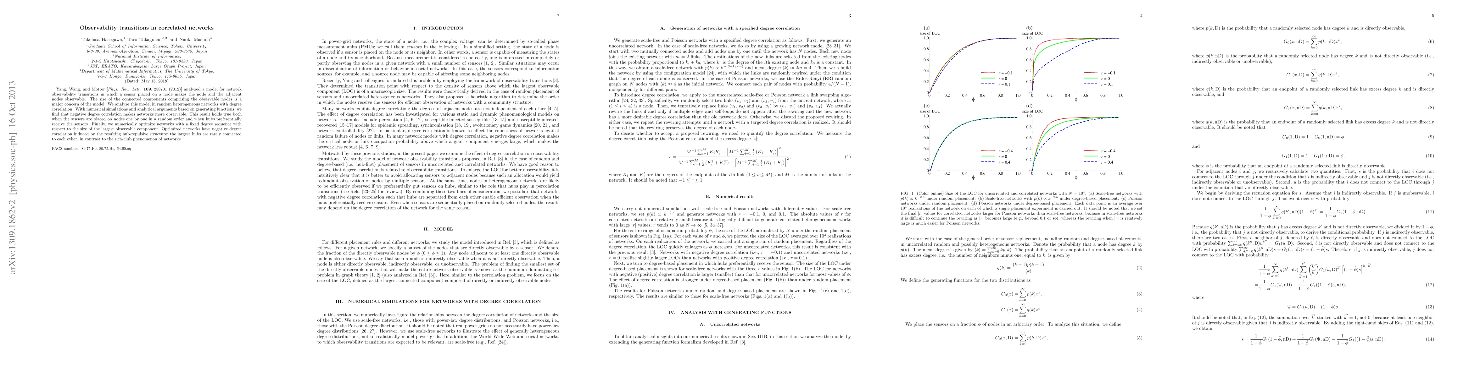 The study analyzes observability transitions in correlated networks using numerical simulations and analytical arguments based on generating functions. It examines a model where sensor placement on a node makes the node and its adjacent nodes observable, focusing on the size of the connected components of observable nodes.