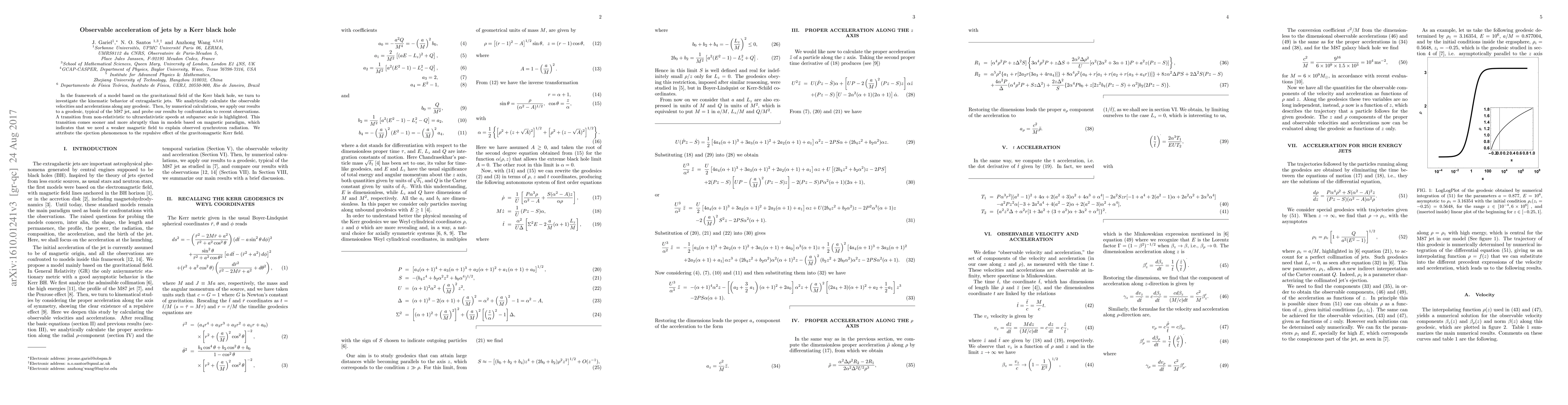 In the framework of a model based on the gravitational field of the Kerr black hole, we turn to investigate the kinematic behavior of extragalactic jets. We analytically calculate the observable velocities and accelerations along any geodesic. Then, by numerical calculations, we apply our results to a geodesic, typical of the M87 jet, and probe our results by confrontation to recent observations. A transition from non-relativistic to ultrarelativistic speeds at subparsec scale is highlighted. This transition comes sooner and more abruptly than in models based on magnetic paradigm, which indicates that we need a weaker magnetic field to explain observed synchrotron radiation. We attribute the ejection phenomenon to the repulsive effect of the gravitomagnetic Kerr field.