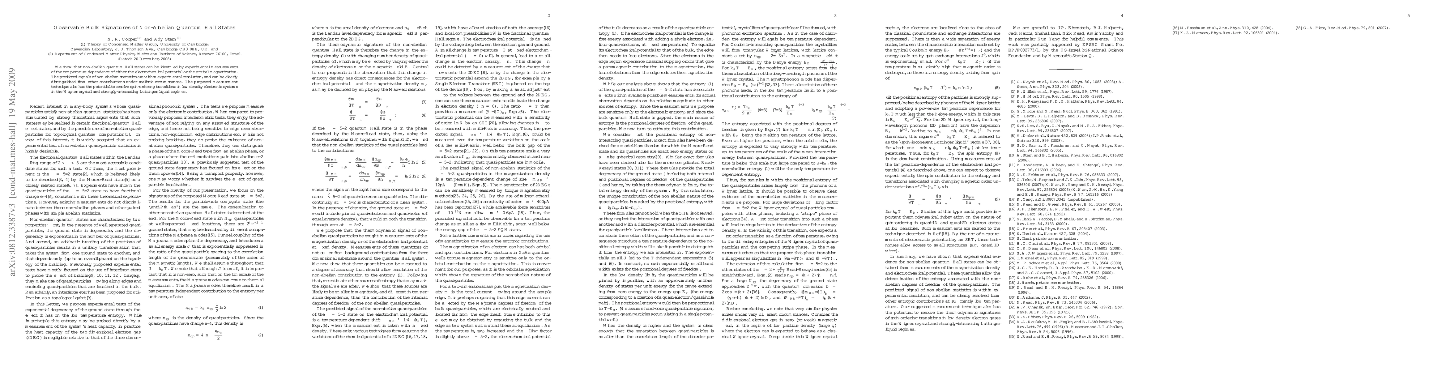 This paper demonstrates a method to experimentally identify non-abelian quantum Hall states through temperature-dependent measurements of electrochemical potential or orbital magnetization, distinguishing them from other contributions. The proposed technique also has potential to reveal spin-ordering transitions in low density electronic systems.