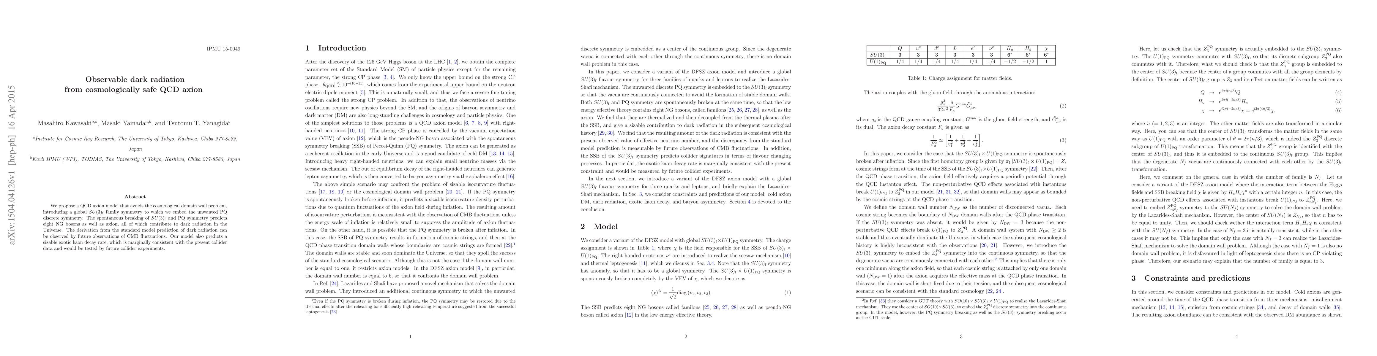 We propose a QCD axion model that avoids the cosmological domain wall problem, introducing a global SU(3)_f family symmetry to which we embed the unwanted PQ discrete symmetry. The spontaneous breaking of SU(3)_f and PQ symmetry predicts eight NG bosons as well as axion, all of which contribute to dark radiation in the Universe. The derivation from the standard model prediction of dark radiation can be observed by future observations of CMB fluctuations. Our model also predicts a sizable exotic kaon decay rate, which is marginally consistent with the present collider data and would be tested by future collider experiments.