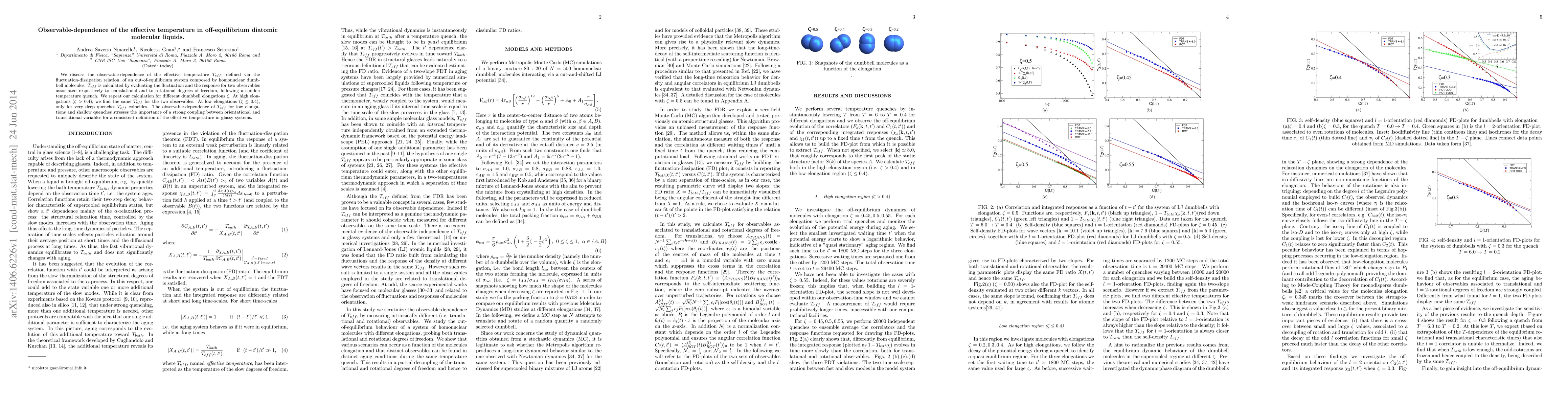 We discuss the observable-dependence of the effective temperature $T_{eff}$, defined via the fluctuation-dissipation relation, of an out-of-equilibrium system composed by homonuclear dumbbell molecules. $T_{eff}$ is calculated by evaluating the fluctuation and the response for two observables associated respectively to translational and to rotational degrees of freedom, following a sudden temperature quench. We repeat our calculation for different dumbbell elongations $\zeta$. At high elongations ($\zeta > 0.4 $), we find the same $T_{eff}$ for the two observables. At low elongations ($\zeta \leq 0.4$), only for very deep quenches $T_{eff}$ coincides. The observable-dependence of $T_{eff}$ for low elongations and shallow quenches stresses the importance of a strong coupling between orientational and translational variables for a consistent definition of the effective temperature in glassy systems.
