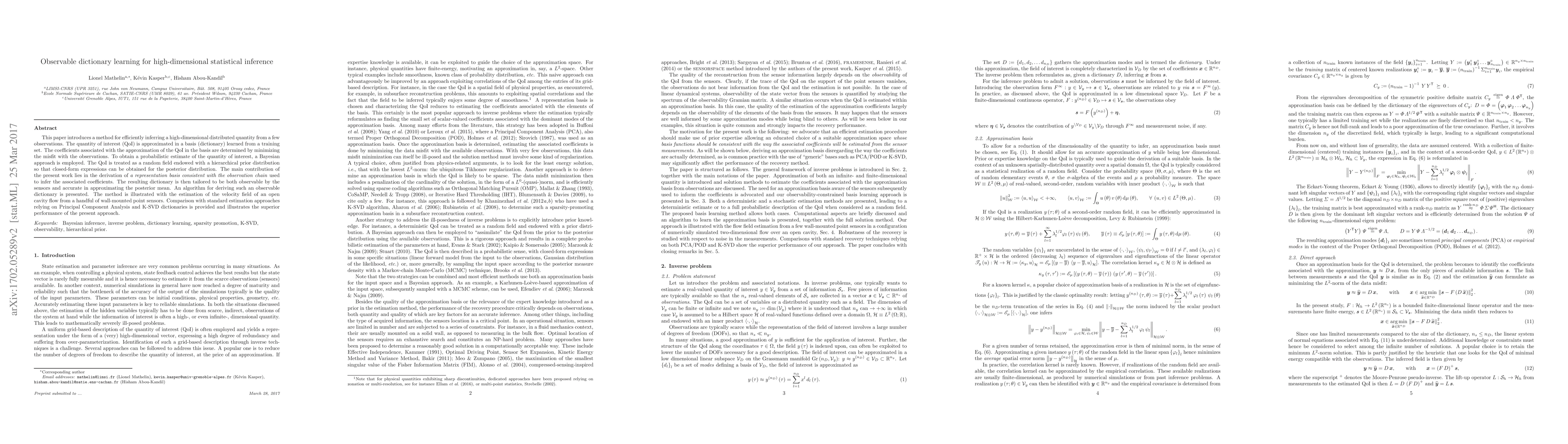 This paper introduces a method for efficiently inferring a high-dimensional distributed quantity from a few observations. The quantity of interest (QoI) is approximated in a basis (dictionary) learned from a training set. The coefficients associated with the approximation of the QoI in the basis are determined by minimizing the misfit with the observations. To obtain a probabilistic estimate of the quantity of interest, a Bayesian approach is employed. The QoI is treated as a random field endowed with a hierarchical prior distribution so that closed-form expressions can be obtained for the posterior distribution. The main contribution of the present work lies in the derivation of \emph{a representation basis consistent with the observation chain} used to infer the associated coefficients. The resulting dictionary is then tailored to be both observable by the sensors and accurate in approximating the posterior mean. An algorithm for deriving such an observable dictionary is presented. The method is illustrated with the estimation of the velocity field of an open cavity flow from a handful of wall-mounted point sensors. Comparison with standard estimation approaches relying on Principal Component Analysis and K-SVD dictionaries is provided and illustrates the superior performance of the present approach.