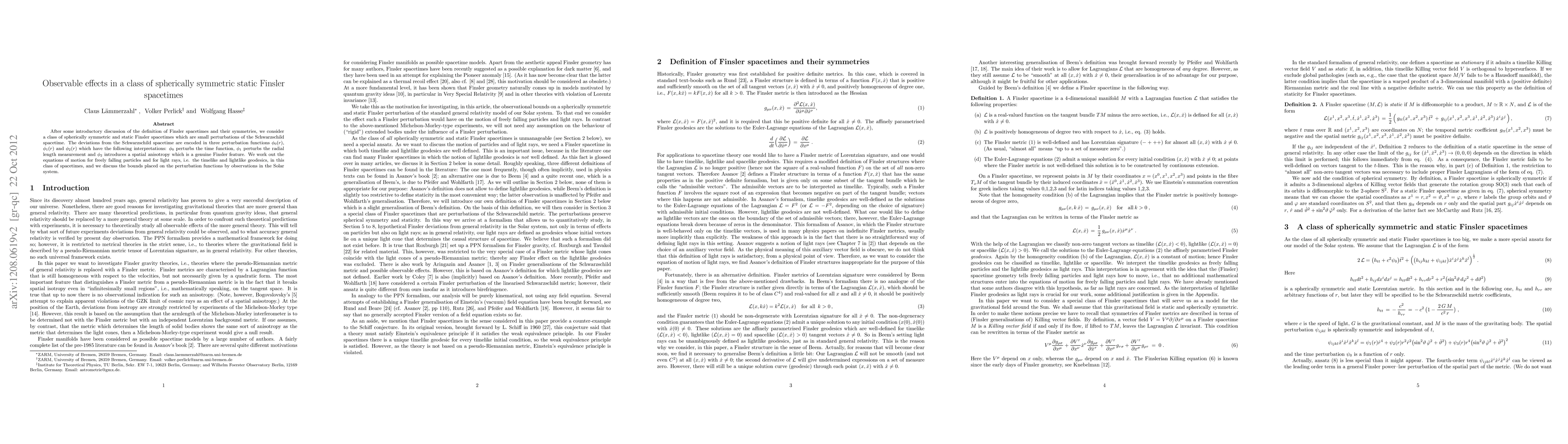 This paper investigates spherically symmetric static Finsler spacetimes, small perturbations of Schwarzschild spacetime, characterized by three functions. It derives equations of motion for particles and light rays, and discusses observational constraints from Solar system data.