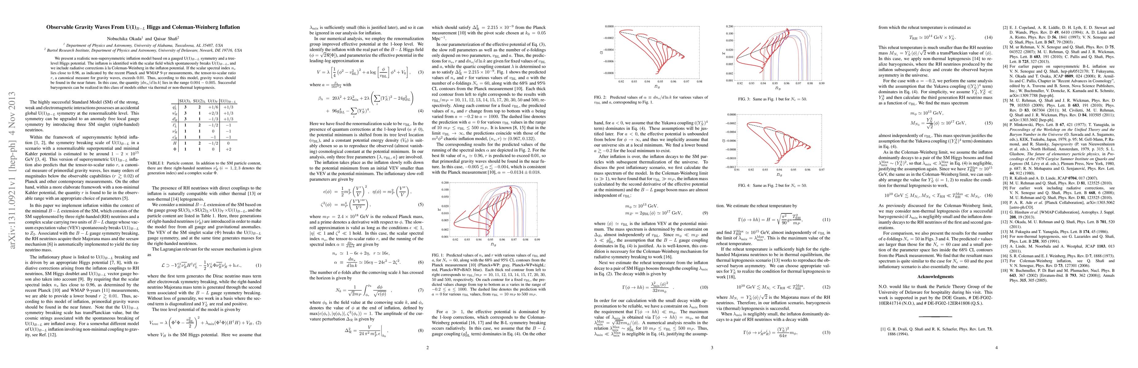 We present a realistic non-supersymmetric inflation model based on a gauged U(1)$_{B-L}$ symmetry and a tree-level Higgs potential. The inflaton is identified with the scalar field which spontaneously breaks U(1)$_{B-L}$, and we include radiative corrections \`a la Coleman-Weinberg in the inflaton potential. If the scalar spectral index $n_s$ lies close to 0.96, as indicated by the recent Planck and WMAP 9-yr measurements, the tensor-to-scalar ratio $r$, a canonical measure for gravity waves, exceeds 0.01. Thus, according to this model, gravity waves should be found in the near future. In this case, the quantity $|dn_s/d \ln k|$ lies in the range $0.004-0.005$. Successful baryogenesis can be realized in this class of models either via thermal or non-thermal leptogenesis.