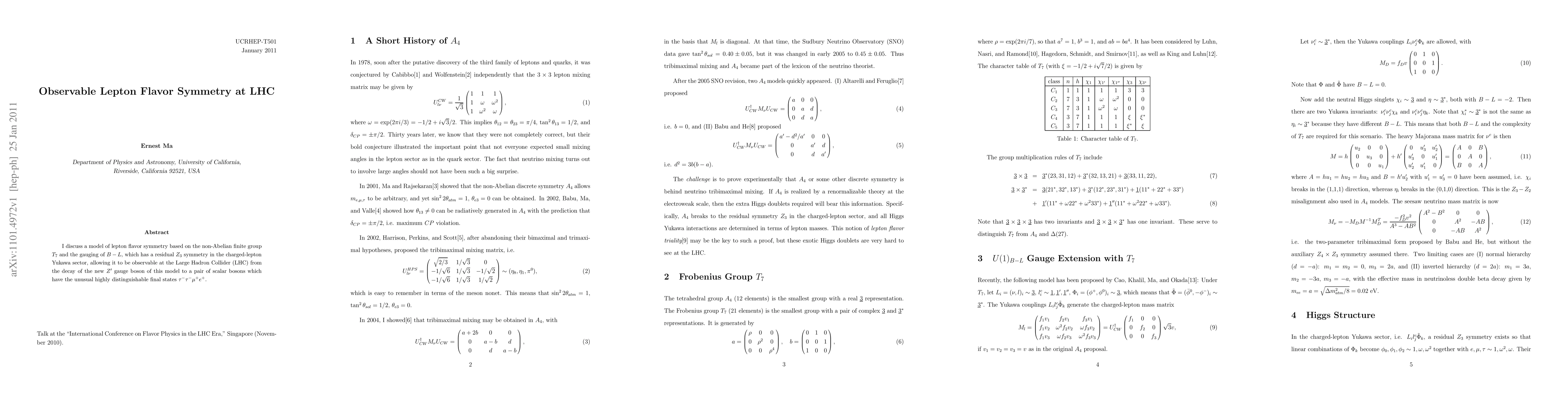 I discuss a model of lepton flavor symmetry based on the non-Abelian finite group T(7) and the gauging of B-L, which has a residual Z(3) symmetry in the charged-lepton Yukawa sector, allowing it to be observable at the Large Hadron Collider (LHC) from the decay of the new Z' gauge boson of this model to a pair of scalar bosons which the unusual highly distinguishable final states tau(-)tau(-)mu(+)e(+).