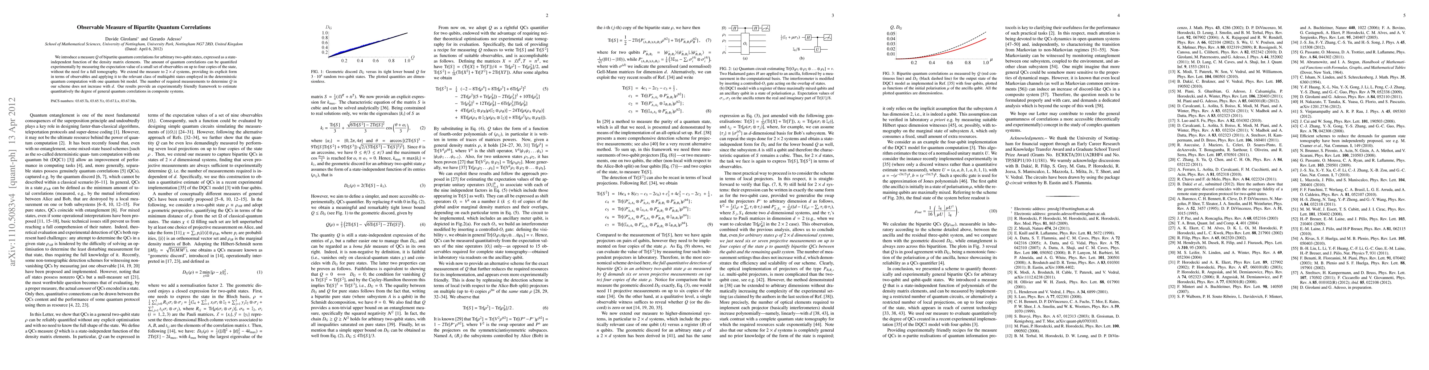 This paper introduces a new measure Q for quantifying bipartite quantum correlations in two-qubit states, expressed as a state-independent function of density matrix elements. The measure can be experimentally determined by measuring the expectation values of a small set of observables on up to four copies of the state, without full tomography, and remains constant in complexity for larger systems.