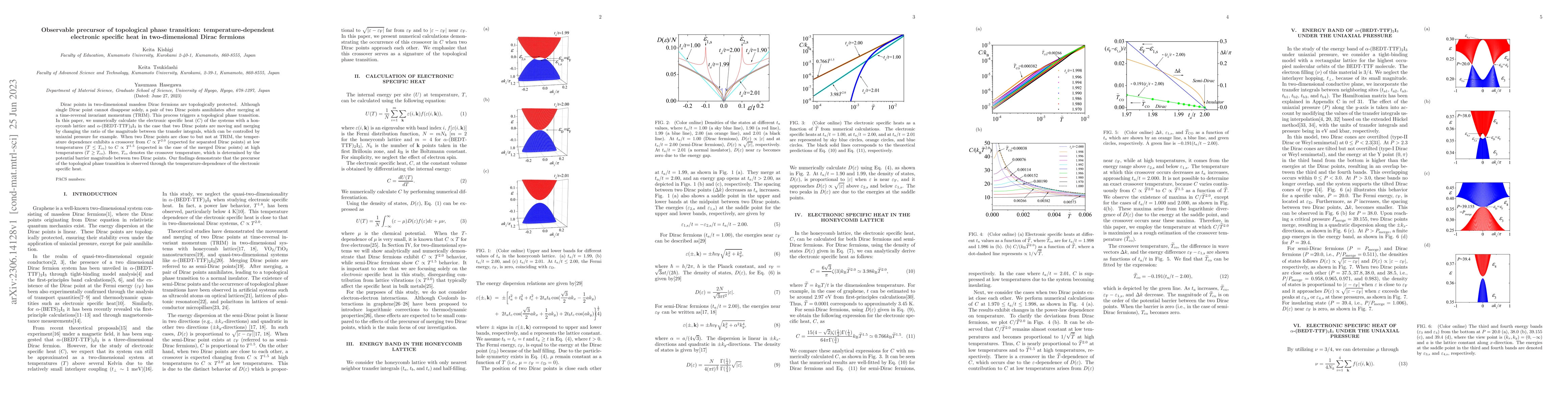 This paper investigates the temperature-dependent electronic specific heat in two-dimensional Dirac fermions, revealing a crossover in $C$ behavior as two Dirac points merge, indicating a precursor to a topological phase transition. The study finds that $C$ changes from $T^{2.0}$ to $T^{1.5}$ as temperature crosses over, marking the impending transition.