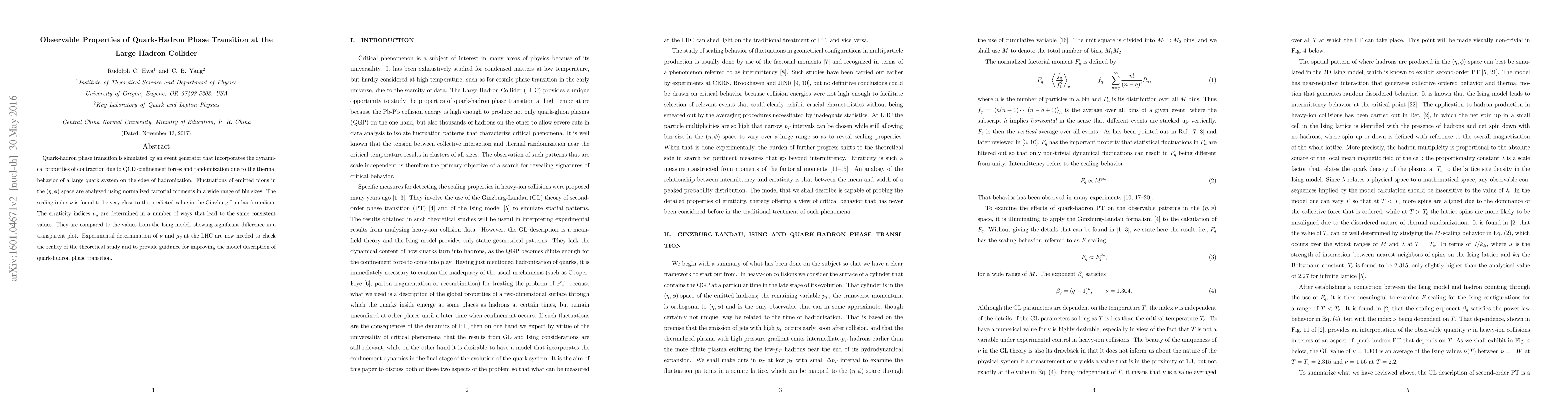 Quark-hadron phase transition is simulated by an event generator that incorporates the dynamical properties of contraction due to QCD confinement forces and randomization due to the thermal behavior of a large quark system on the edge of hadronization. Fluctuations of emitted pions in the $(\eta,\phi)$ space are analyzed using normalized factorial moments in a wide range of bin sizes. The scaling index $\nu$ is found to be very close to the predicted value in the Ginzburg-Landau formalism. The erraticity indices $\mu_q$ are determined in a number of ways that lead to the same consistent values. They are compared to the values from the Ising model, showing significant difference in a transparent plot. Experimental determination of $\nu$ and $\mu_q$ at the LHC are now needed to check the reality of the theoretical study and to provide guidance for improving the model description of quark-hadron phase transition.