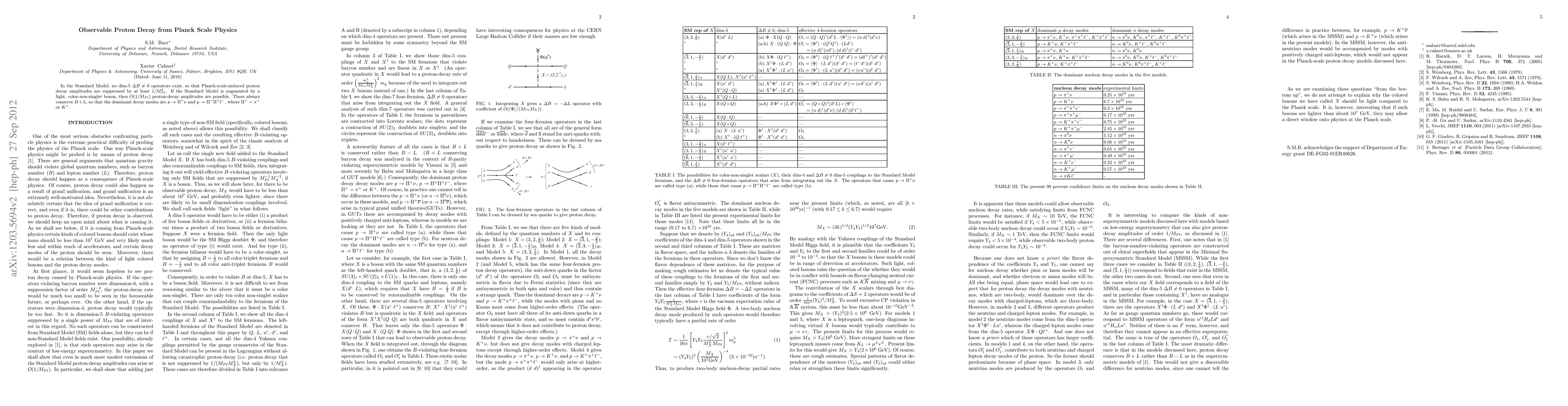 This paper explores how augmenting the Standard Model with a light, color-non-singlet boson can enable observable proton decay at the Planck scale, with dominant decay modes being $p \rightarrow \Pi^+ \nu$ and $p \rightarrow \Pi^+ \Pi^+ \ell^-$. The presence of such a boson allows for $O(1/M_{P \ell})$ decay amplitudes, contrasting the suppressed decay in the Standard Model alone.