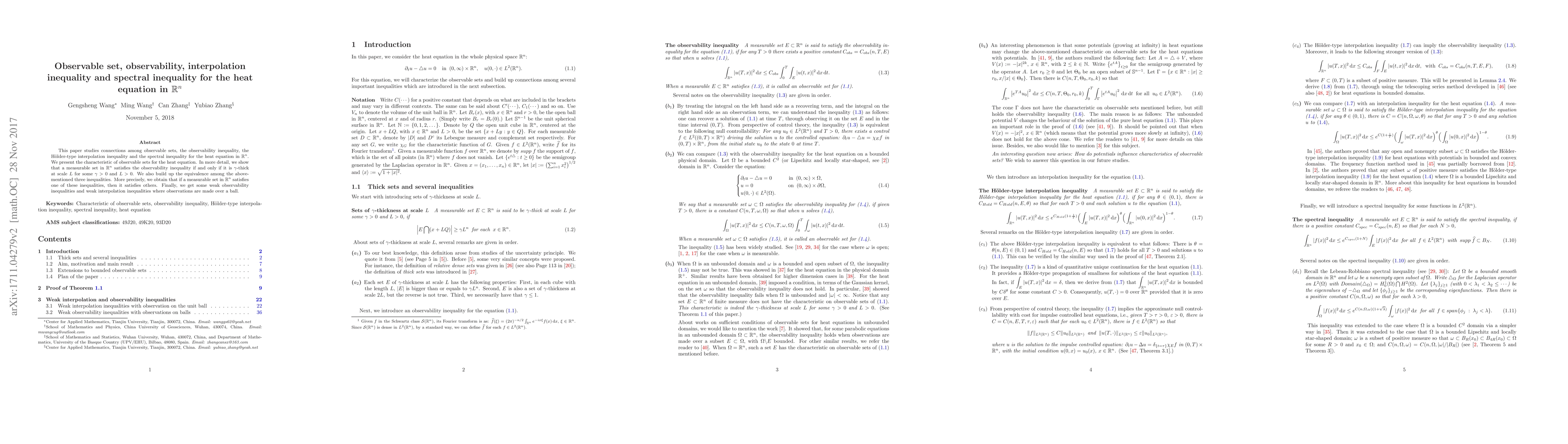 This paper studies connections among observable sets, the observability inequality, the H\"{o}lder-type interpolation inequality and the spectral inequality for the heat equation in $\mathbb R^n$. We present a characteristic of observable sets for the heat equation. In more detail, we show that a measurable set in $\mathbb{R}^n$ satisfies the observability inequality if and only if it is $\gamma$-thick at scale $L$ for some $\gamma>0$ and $L>0$.We also build up the equivalence among the above-mentioned three inequalities. More precisely, we obtain that if a measurable set $E\subset\mathbb{R}^n$ satisfies one of these inequalities, then it satisfies others. Finally, we get some weak observability inequalities and weak interpolation inequalities where observations are made over a ball.