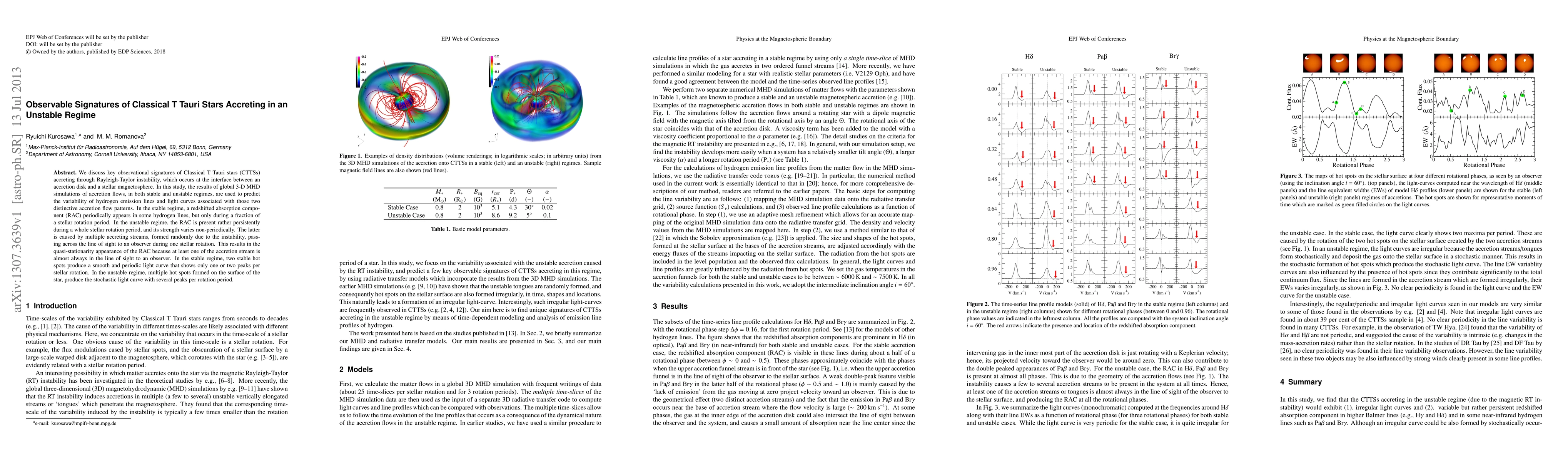 We discuss key observational signatures of Classical T Tauri stars (CTTSs) accreting through Rayleigh-Taylor instability, which occurs at the interface between an accretion disk and a stellar magnetosphere. In this study, the results of global 3-D MHD simulations of accretion flows, in both stable and unstable regimes, are used to predict the variability of hydrogen emission lines and light curves associated with those two distinctive accretion flow patterns. In the stable regime, a redshifted absorption component (RAC) periodically appears in some hydrogen lines, but only during a fraction of a stellar rotation period. In the unstable regime, the RAC is present rather persistently during a whole stellar rotation period, and its strength varies non-periodically. The latter is caused by multiple accreting streams, formed randomly due to the instability, passing across the line of sight to an observer during one stellar rotation. This results in the quasi-stationarity appearance of the RAC because at least one of the accretion stream is almost always in the line of sight to an observer. In the stable regime, two stable hot spots produce a smooth and periodic light curve that shows only one or two peaks per stellar rotation. In the unstable regime, multiple hot spots formed on the surface of the star, produce the stochastic light curve with several peaks per rotation period.