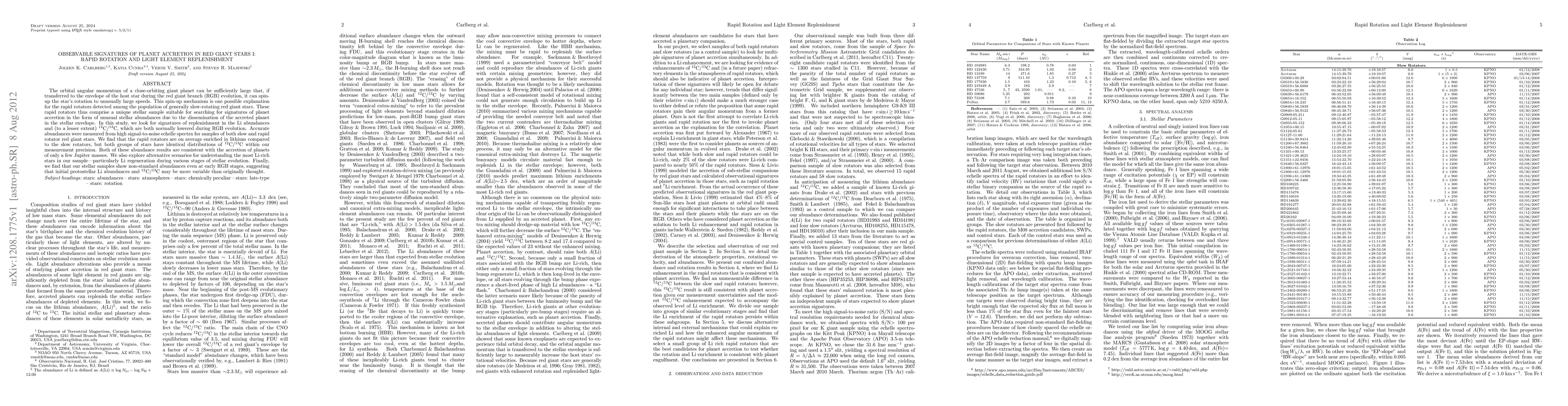 This paper investigates rapid rotation and light element replenishment in red giant stars, suggesting that the accretion of close-orbiting giant planets can spin-up the stars and replenish lithium abundances. The study finds that rapid rotators show higher lithium levels compared to slow rotators, supporting the hypothesis of planet accretion, while both groups show similar carbon isotope ratios.
