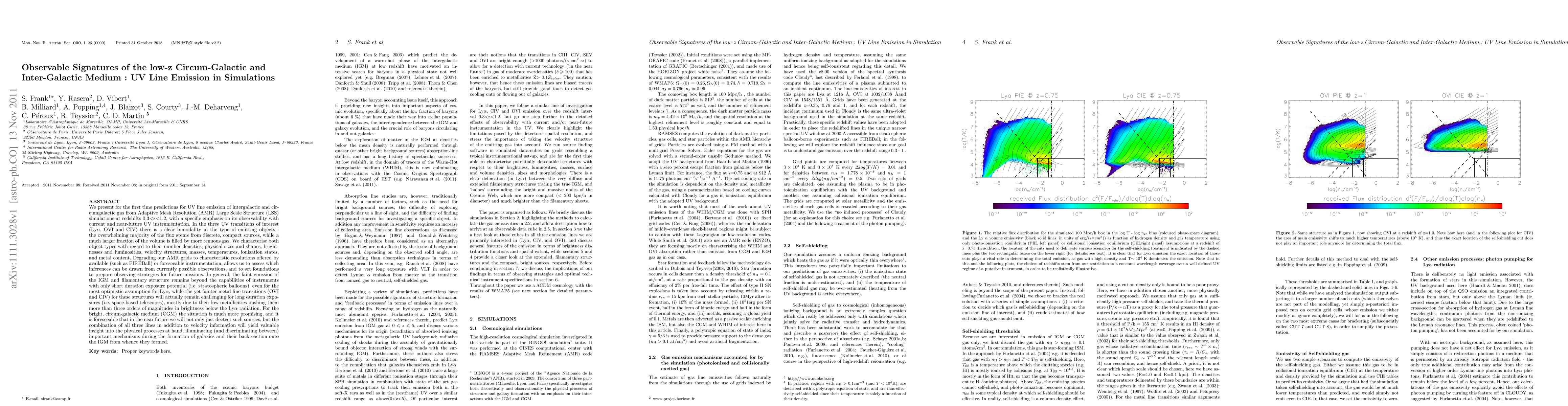 This research uses AMR LSS simulations to predict UV line emission from intergalactic and circumgalactic gas at 0.3<z<1.1, highlighting observability with current/near-future instruments. It reveals bimodal distributions in Lya, OVI, and CIV transitions, with most flux from compact sources against a vast, tenuous gas background. The study assesses observational feasibility, finding that while faint IGM and filament emission remains challenging, near-future observations of the CGM could provide insights into galaxy formation processes.