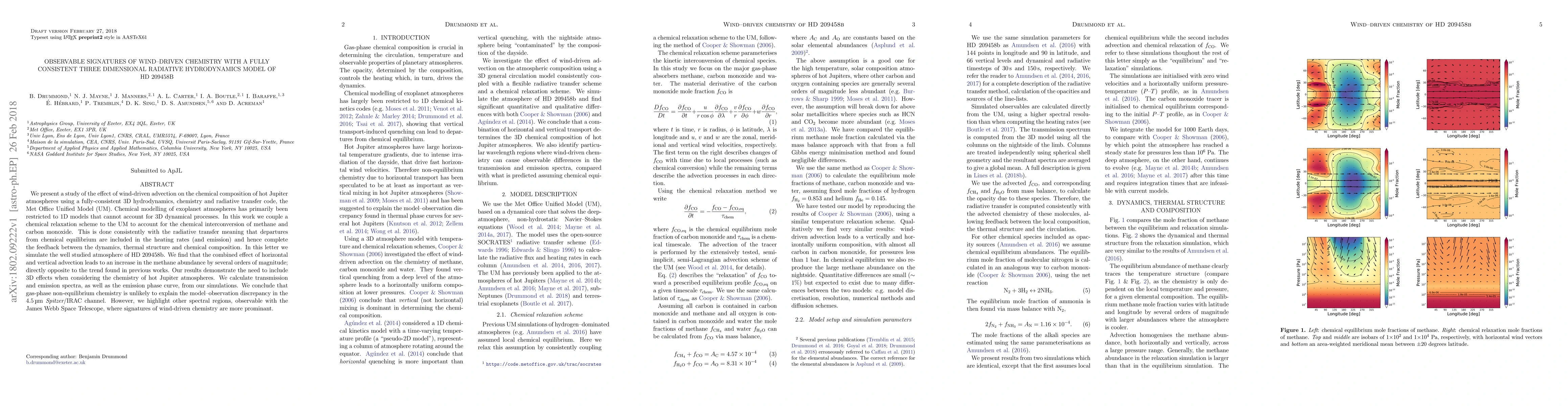 This study uses a 3D radiative hydrodynamics model to investigate wind-driven chemistry in the atmosphere of HD 209458b, finding that horizontal and vertical advection significantly increase methane abundance. The model suggests that gas-phase non-equilibrium chemistry is unlikely to resolve the observed discrepancy in the 4.5 μm Spitzer channel, but highlights other spectral regions detectable by the James Webb Space Telescope.