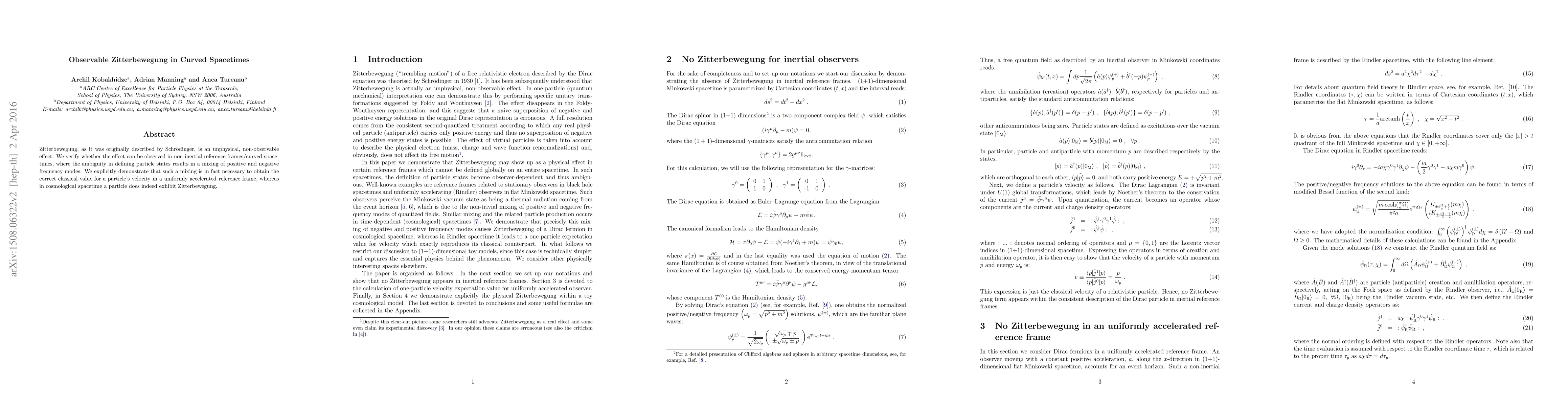 This study investigates if Zitterbewegung, traditionally an unobservable effect, can manifest in non-inertial frames and curved spacetimes, revealing that a mixing of positive and negative frequency modes is necessary for correct classical velocity calculations, with an observable effect in cosmological spacetimes.