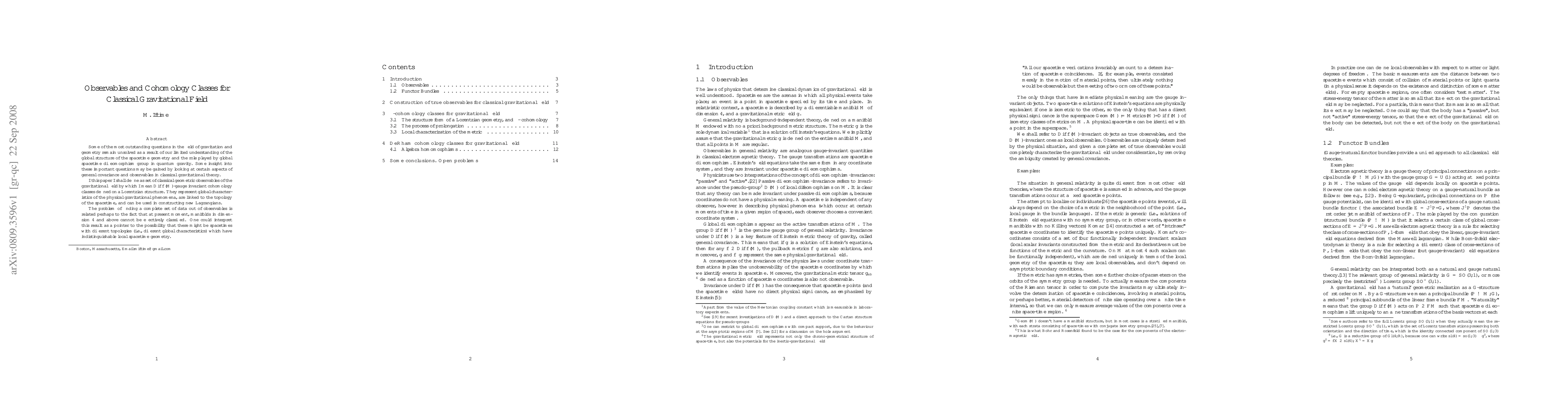Some of the most outstanding questions in the field of gravitation and geometry remain unsolved as a result of our limited understanding of the global structure of the spacetime geometry and the role played by global spacetime diffeomorphism group in quantum gravity. Some insight into these important questions may be gained by looking at certain aspects of general covariance and observables in classical gravitational theory. In this paper I shall define as set of classical geometric observables of the gravitational field by which I mean Diff(M)-gauge invariant cohomology classes defined on a Lorentzian structure. They represent global characteristics of the physical gravitational phenomena, are linked to the topology of the spacetime, and can be used in constructing new Lagrangians. The problem of finding a complete set of data out of observables is related perhaps to the fact that at present moment, manifolds in dimension 4 and above cannot be effectively classified. One could interpret this result as a pointer to the possibility that there might be spacetimes with different topologies (i.e., different global characteristics) which have indistinguishable local spacetime geometry.