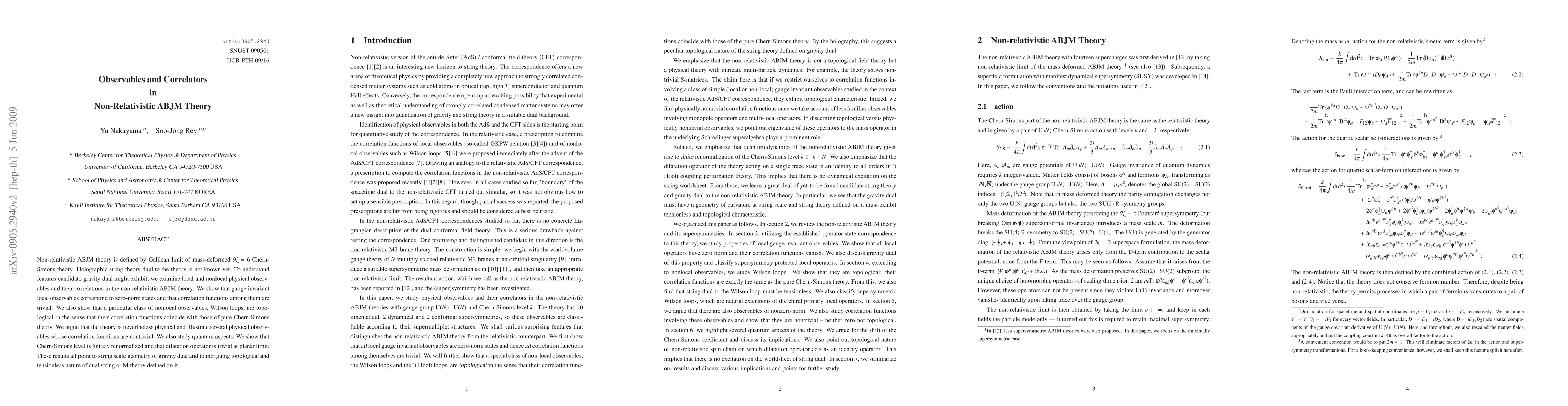 The study investigates observables and correlators in nonrelativistic ABJM theory, finding that gauge invariant local observables correspond to zero-norm states with trivial correlation functions. Nonlocal observables, such as Wilson loops, are shown to be topological, resembling pure Chern-Simons theory, while other physical observables have nontrivial correlation functions, suggesting a string scale geometry for the gravity dual with a topological and tensionless nature.