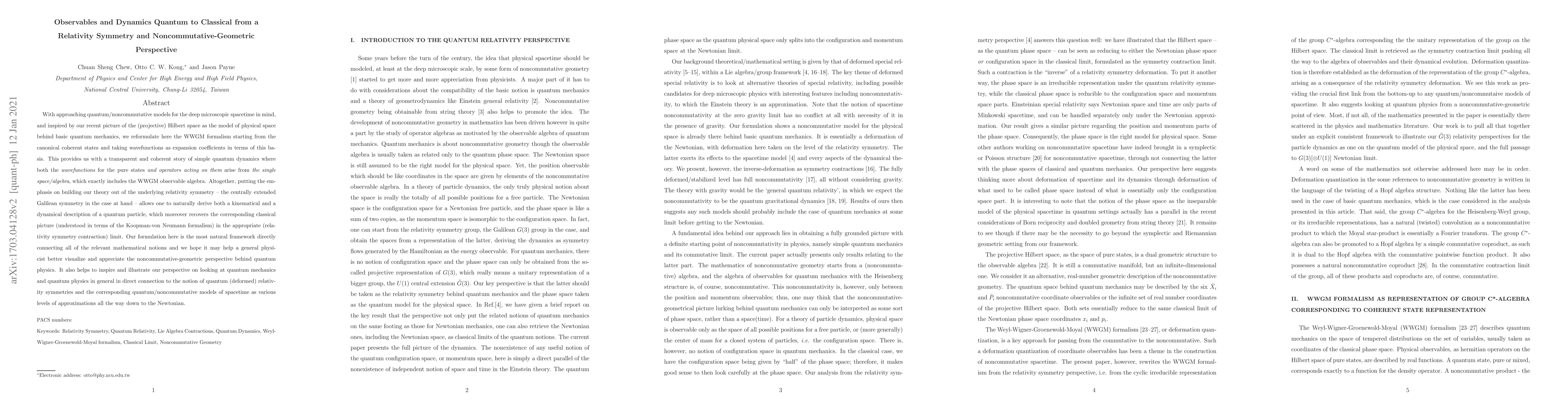 With approaching quantum/noncommutative models for the deep microscopic spacetime in mind, and inspired by our recent picture of the (projective) Hilbert space as the model of physical space behind basic quantum mechanics, we reformulate here the WWGM formalism starting from the canonical coherent states and taking wavefunctions as expansion coefficients in terms of this basis. This provides us with a transparent and coherent story of simple quantum dynamics where both the wavefunctions for the pure states and operators acting on them arise from the single space/algebra, which exactly includes the WWGM observable algebra. Altogether, putting the emphasis on building our theory out of the underlying relativity symmetry -- the centrally extended Galilean symmetry in the case at hand -- allows one to naturally derive both a kinematical and a dynamical description of a quantum particle, which moreover recovers the corresponding classical picture (understood in terms of the Koopman-von Neumann formalism) in the appropriate (relativity symmetry contraction) limit. Our formulation here is the most natural framework directly connecting all of the relevant mathematical notions and we hope it may help a general physicist better visualize and appreciate the noncommutative-geometric perspective behind quantum physics. It also helps to inspire and illustrate our perspective on looking at quantum mechanics and quantum physics in general in direct connection to the notion of quantum (deformed) relativity symmetries and the corresponding quantum/noncommutative models of spacetime as various levels of approximations all the way down to the Newtonian.
