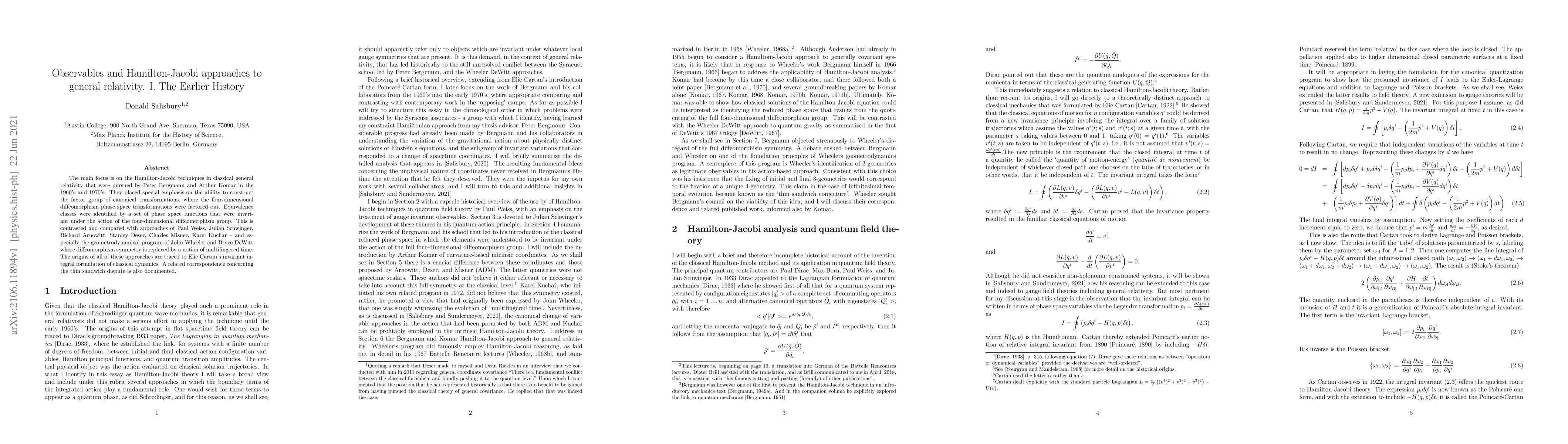 The main focus is on the Hamilton-Jacobi techniques in classical general relativity that were pursued by Peter Bergmann and Arthur Komar in the 1960's and 1970's. They placed special emphasis on the ability to construct the factor group of canonical transformations, where the four-dimensional diffeomorphism phase space transformations were factored out. Equivalence classes were identified by a set of phase space functions that were invariant under the action of the four-dimensional diffeomorphism group. This is contrasted and compared with approaches of Paul Weiss, Julian Schwinger, Richard Arnowitt, Stanley Deser, Charles Misner, Karel Kuchar - and especially the geometrodynamical program of John Wheeler and Bryce DeWitt where diffeomorphism symmetry is replaced by a notion of multifingered time. The origins of all of these approaches are traced to Elie Cartan's invariant integral formulation of classical dynamics. A related correspondence concerning the thin sandwich dispute is also documented.
