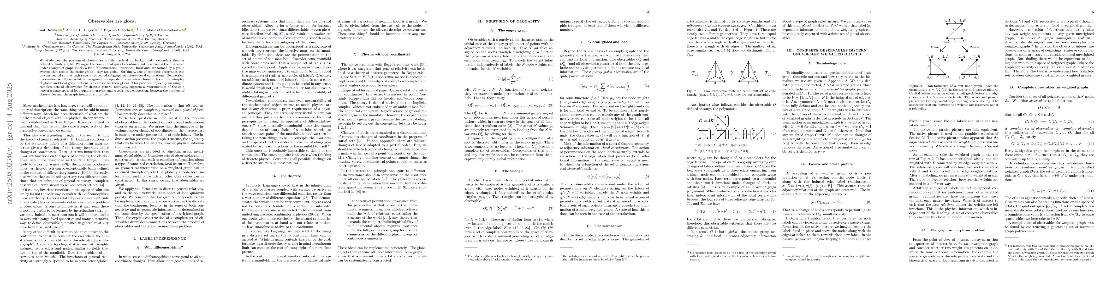 The research employs a background-independent approach using finite graphs, focusing on permutation invariance as a replacement for coordinate independence. It introduces the concept of 'glocal' observables, which are global in nature yet probe local correlations within connected subgraphs.