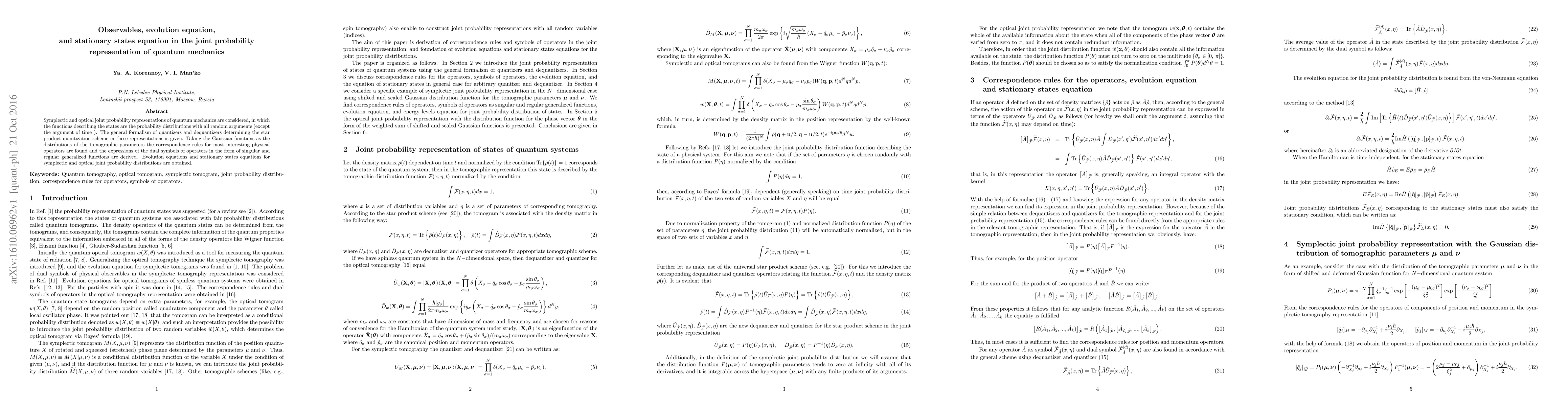 Symplectic and optical joint probability representations of quantum mechanics are considered, in which the functions describing the states are the probability distributions with all random arguments (except the argument of time ). The general formalism of quantizers and dequantizers determining the star product quantization scheme in these representations is given. Taking the Gaussian functions as the distributions of the tomographic parameters the correspondence rules for most interesting physical operators are found and the expressions of the dual symbols of operators in the form of singular and regular generalized functions are derived. Evolution equations and stationary states equations for symplectic and optical joint probability distributions are obtained.