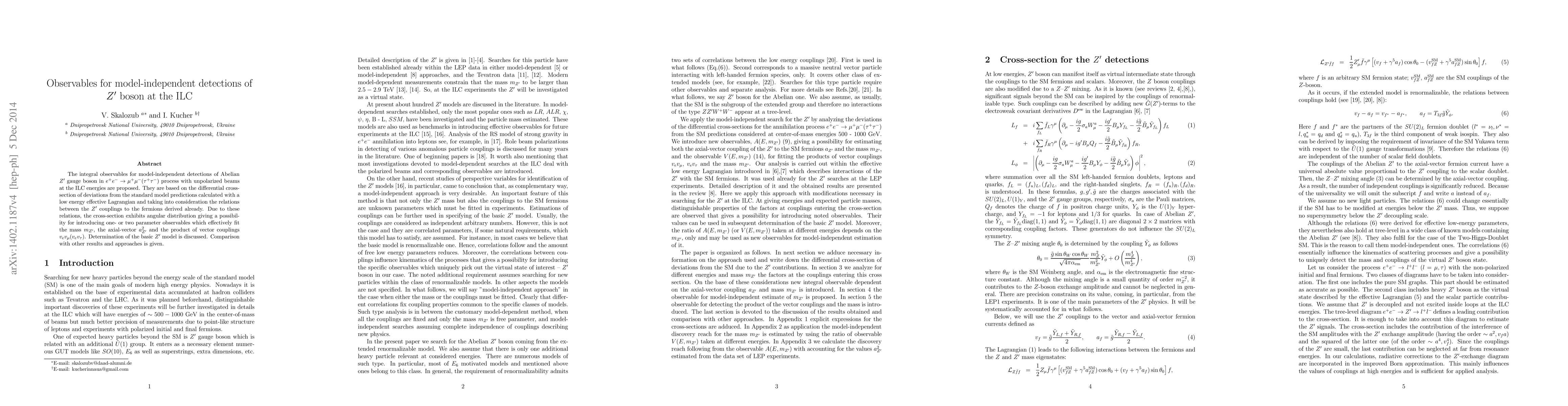 The integral observables for model-independent detections of Abelian Z' gauge boson in e^+ e^- -> mu^+ mu^- (tau^+ \tau^-) process with unpolarized beams at the ILC energies are proposed. They are based on the differential cross-section of deviations from the standard model predictions calculated with a low energy effective Lagrangian and taking into consideration the relations between the Z' couplings to the fermions derived already. Due to these relations, the cross-section exhibits angular distribution giving a possibility for introducing one- or two parameter observables which effectively fit the mass m_Z', the axial-vector (a_Z)'^2 and the product of vector couplings v_e v_mu (v_e v_tau). Comparison with other results and approaches is given.