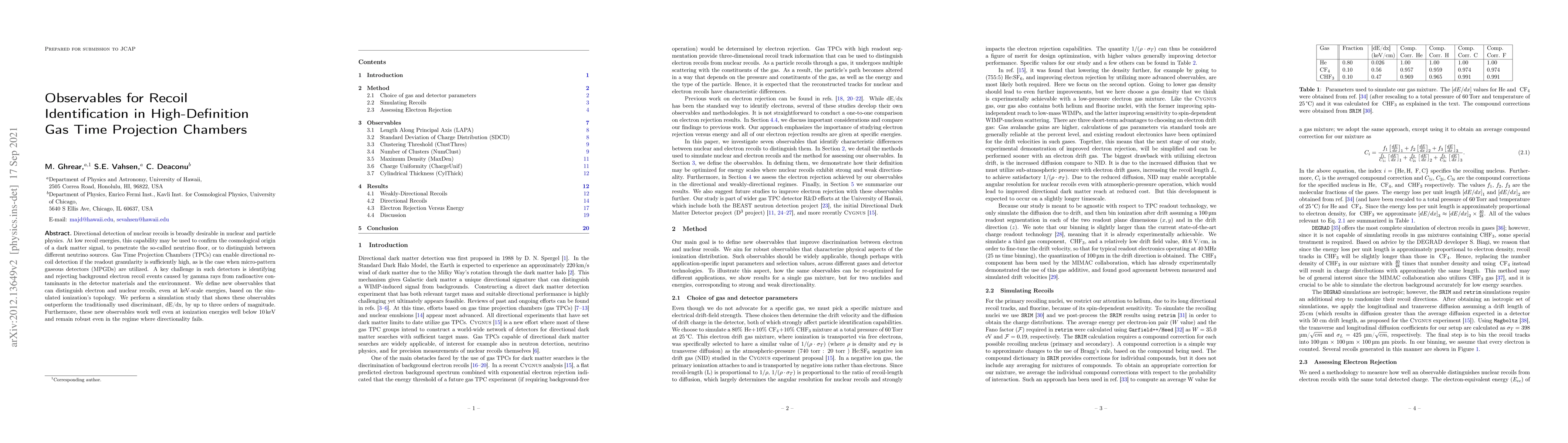 Directional detection of nuclear recoils is broadly desirable in nuclear and particle physics. At low recoil energies, this capability may be used to confirm the cosmological origin of a dark matter signal, to penetrate the so-called neutrino floor, or to distinguish between different neutrino sources. Gas Time Projection Chambers (TPCs) can enable directional recoil detection if the readout granularity is sufficiently high, as is the case when micro-pattern gaseous detectors (MPGDs) are utilized. A key challenge in such detectors is identifying and rejecting background electron recoil events caused by gamma rays from radioactive contaminants in the detector materials and the environment. We define new observables that can distinguish electron and nuclear recoils, even at keV-scale energies, based on the simulated ionization's topology. We perform a simulation study that shows these observables outperform the traditionally used discriminant, dE/dx, by up to three orders of magnitude. Furthermore, these new observables work well even at ionization energies well below 10 keV and remain robust even in the regime where directionality fails.