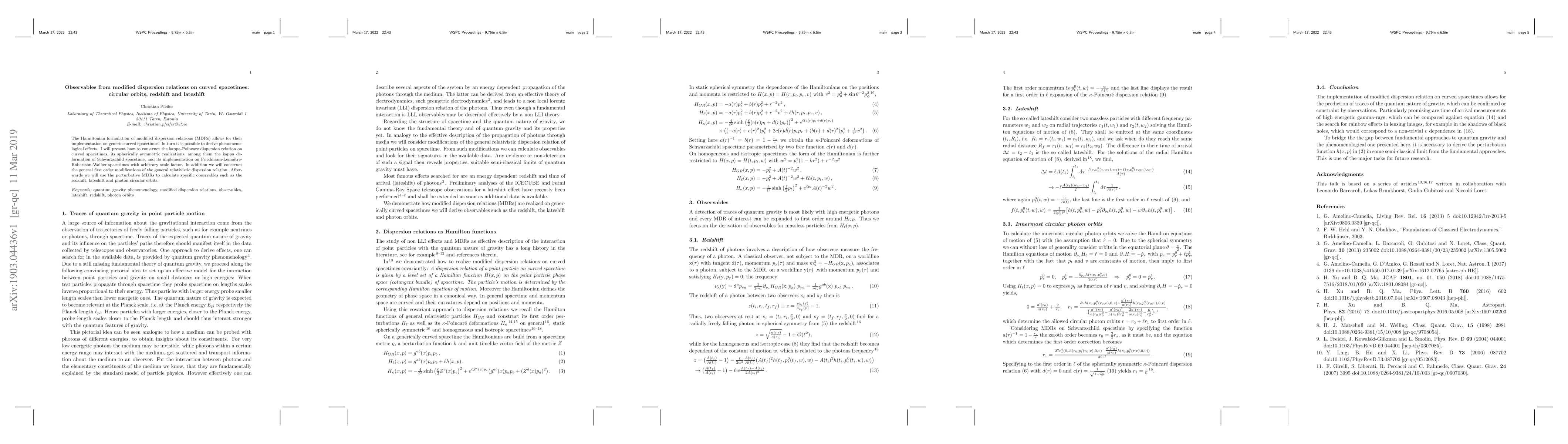 The Hamiltonian formulation of modified dispersion relations (MDRs) allows for their implementation on generic curved spacetimes. In turn it is possible to derive phenomenological effects. I will present how to construct the kappa-Poincare dispersion relation on curved spacetimes, its spherically symmetric realizations, among them the kappa deformation of Schwarzschild spacetime, and its implementation on Friedmann-Lemaitre-Robertson-Walker spacetimes with arbitrary scale factor. In addition we will construct the general first order modifications of the general relativistic dispersion relation. Afterwards we will use the perturbative MDRs to calculate specific observables such as the redshift, lateshift and photon circular orbits.