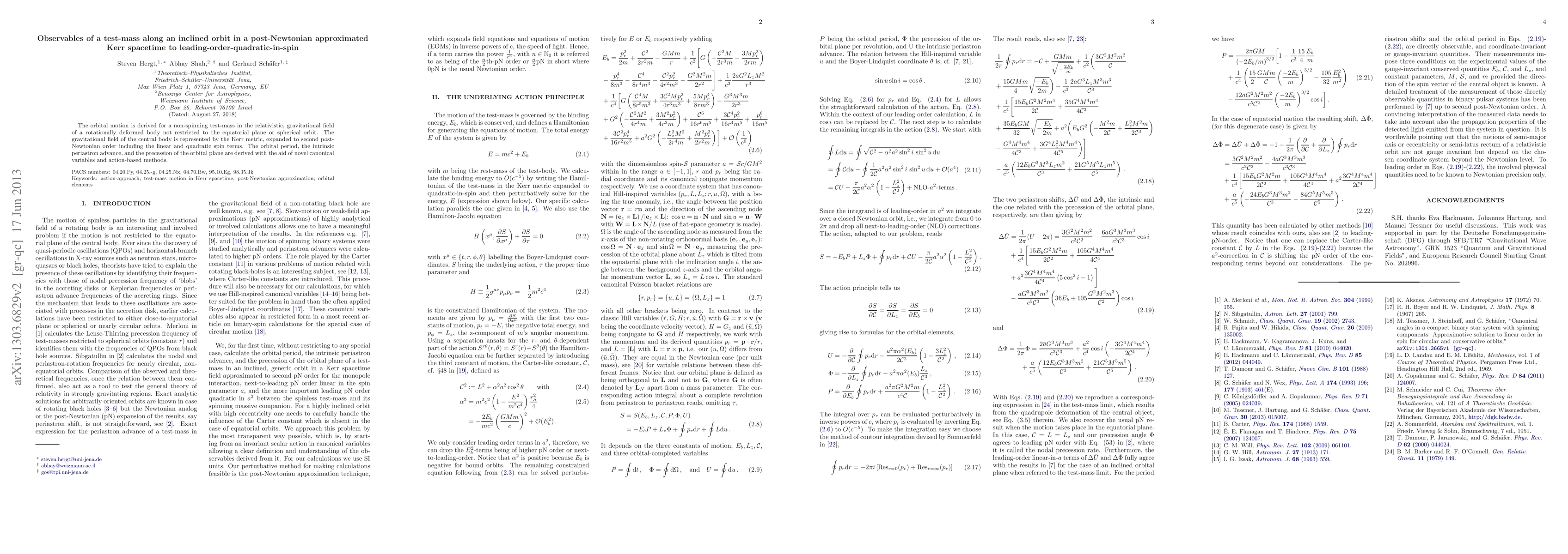 The orbital motion is derived for a non-spinning test-mass in the relativistic, gravitational field of a rotationally deformed body not restricted to the equatorial plane or spherical orbit. The gravitational field of the central body is represented by the Kerr metric, expanded to second post-Newtonian order including the linear and quadratic spin terms. The orbital period, the intrinsic periastron advance, and the precession of the orbital plane are derived with the aid of novel canonical variables and action-based methods.