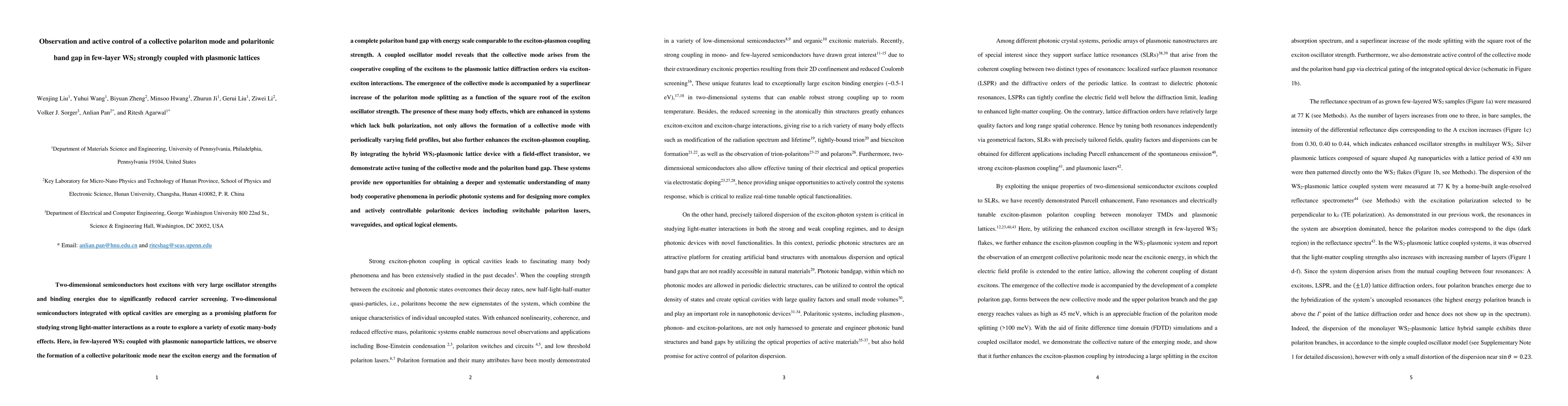 This paper reports on the observation of a collective polariton mode and a polaritonic band gap in few-layer WS2 strongly coupled with plasmonic nanoparticle lattices, revealing cooperative exciton-plasmon interactions. The study demonstrates active tuning of these modes using a field-effect transistor, highlighting potential for developing controllable polaritonic devices.