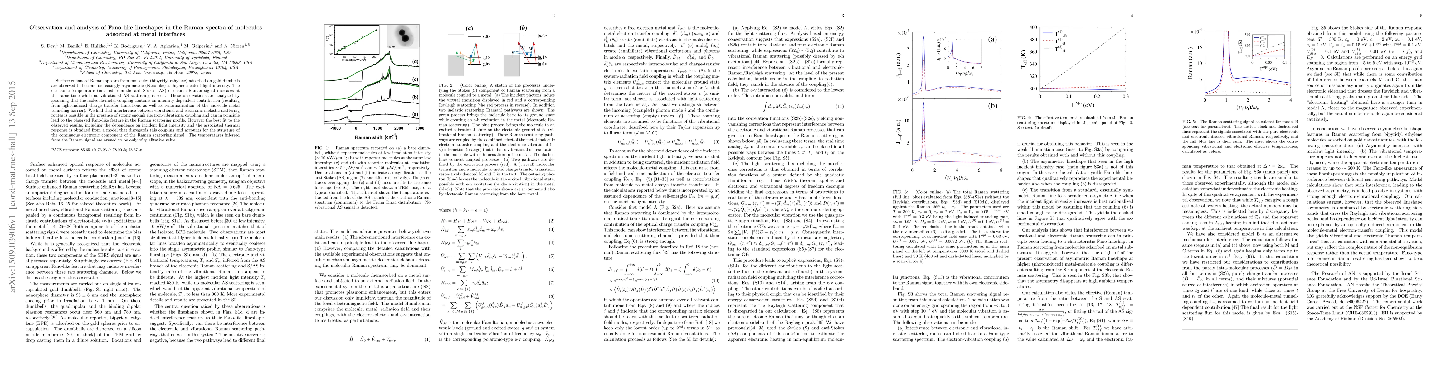 Surface enhanced Raman spectra from molecules (bipyridyl ethylene) adsorbed on gold dumbells are observed to become increasingly asymmetric (Fano-like) at higher incident light intensity. The electronic temperature (inferred from the anti-Stokes (AS) electronic Raman signal increases at the same time while no vibrational AS scattering is seen. These observations are analyzed by assuming that the molecule-metal coupling contains an intensity dependent contribution (resulting from light-induced charge transfer transitions as well as renormalization of the molecule metal tunneling barrier). We find that interference between vibrational and electronic inelastic scattering routes is possible in the presence of strong enough electron-vibrational coupling and can in principle lead to the observed Fano-like feature in the Raman scattering profile. However the best fit to the observed results, including the dependence on incident light intensity and the associated thermal response is obtained from a model that disregards this coupling and accounts for the structure of the continuous electronic component of the Raman scattering signal. The temperatures inferred from the Raman signal are argued to be only of qualitative value.