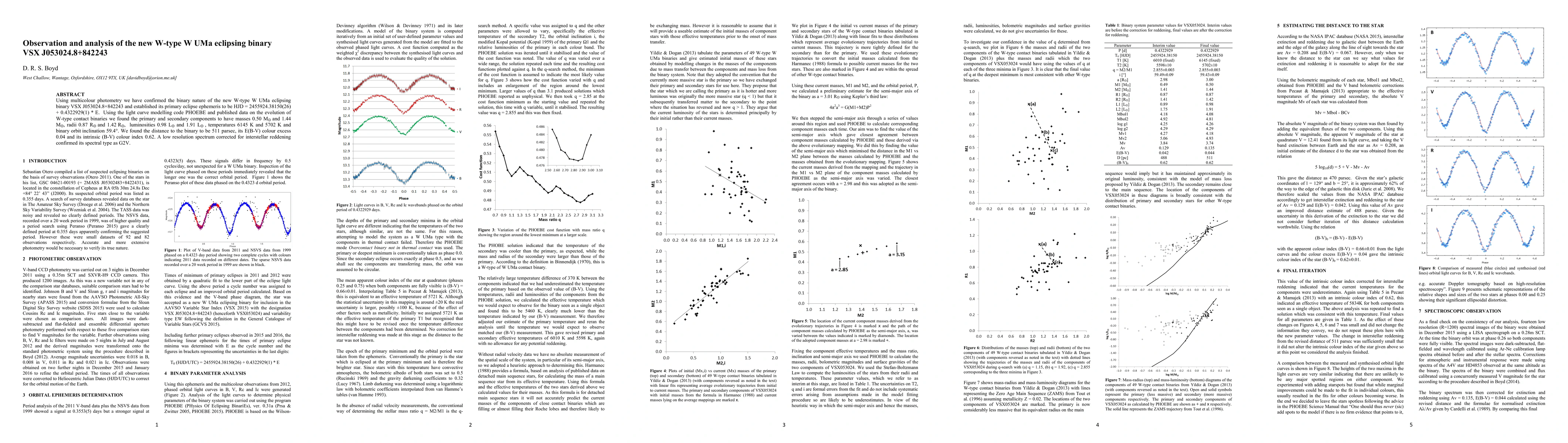 The research confirms VSX J053024.8+842243 as a new W-type W UMa eclipsing binary, determining its primary and secondary component masses, radii, luminosities, temperatures, and orbit inclination. It also estimates the binary's distance, color excess, and intrinsic color index, confirming its spectral type as G2V using low-resolution spectroscopy.