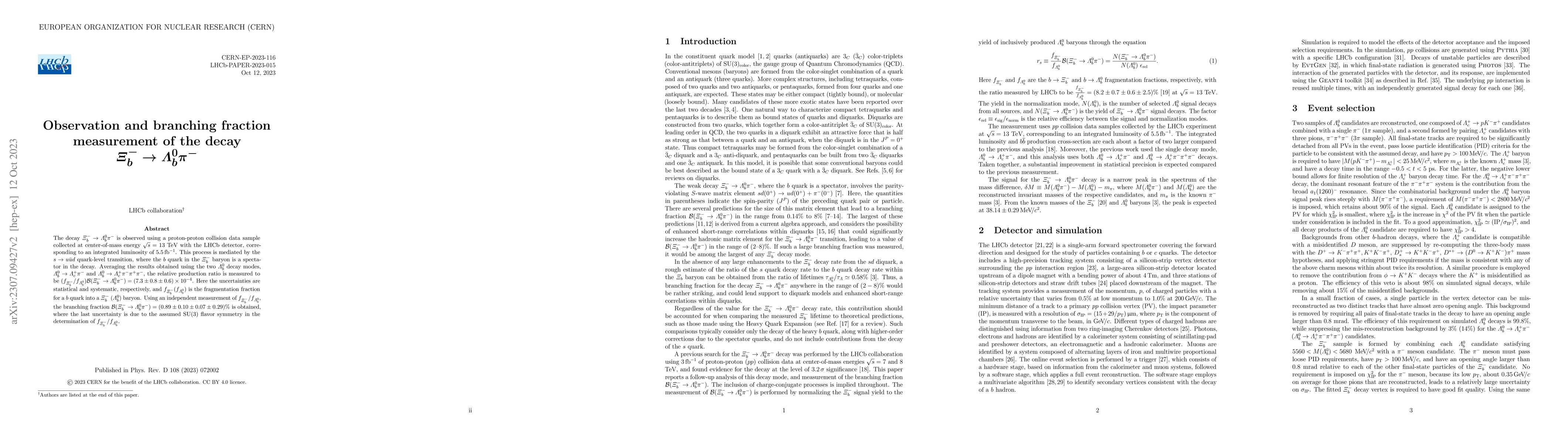 The decay $\Xi_b^-\to\Lambda_b^0\pi^-$ is observed in LHCb data from proton-proton collisions at 13 TeV, yielding a branching fraction of $(0.89\pm0.10\pm0.07\pm0.29)\%$. This decay involves a $s\to u\bar{u}d$ quark-level transition with the $b$ quark as a spectator.