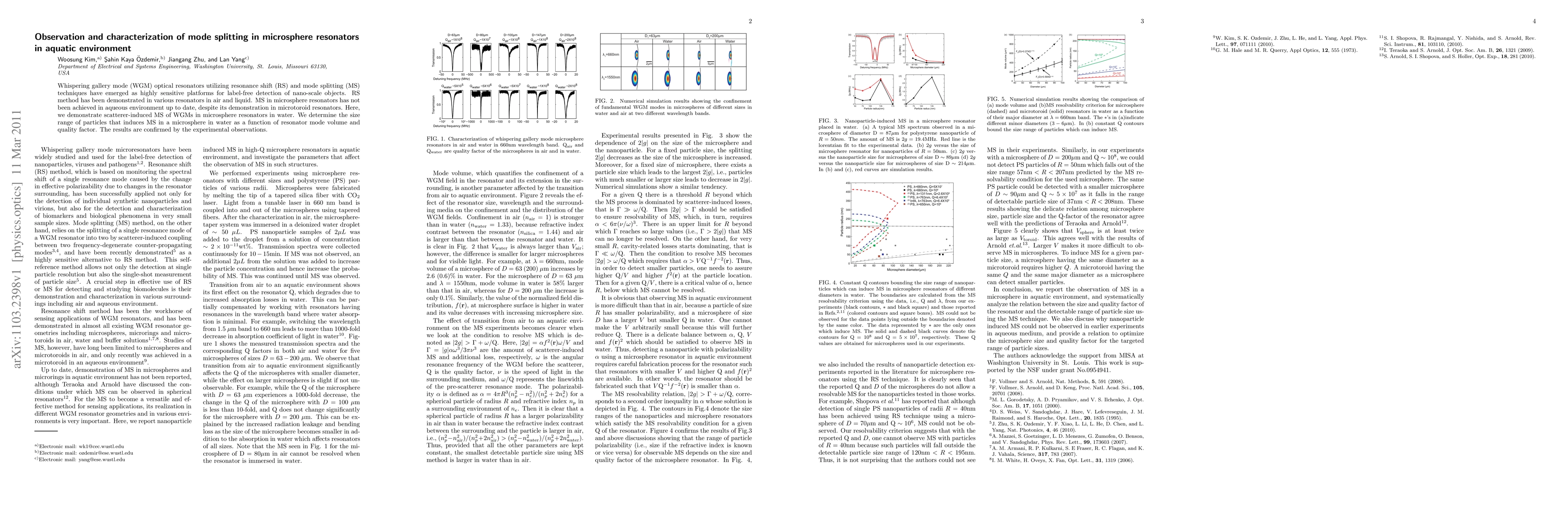 This paper demonstrates scatterer-induced mode splitting in whispering gallery mode optical resonators within an aquatic environment for the first time, determining the size range of particles that induce this effect based on the resonator's mode volume and quality factor, and confirming the results experimentally.