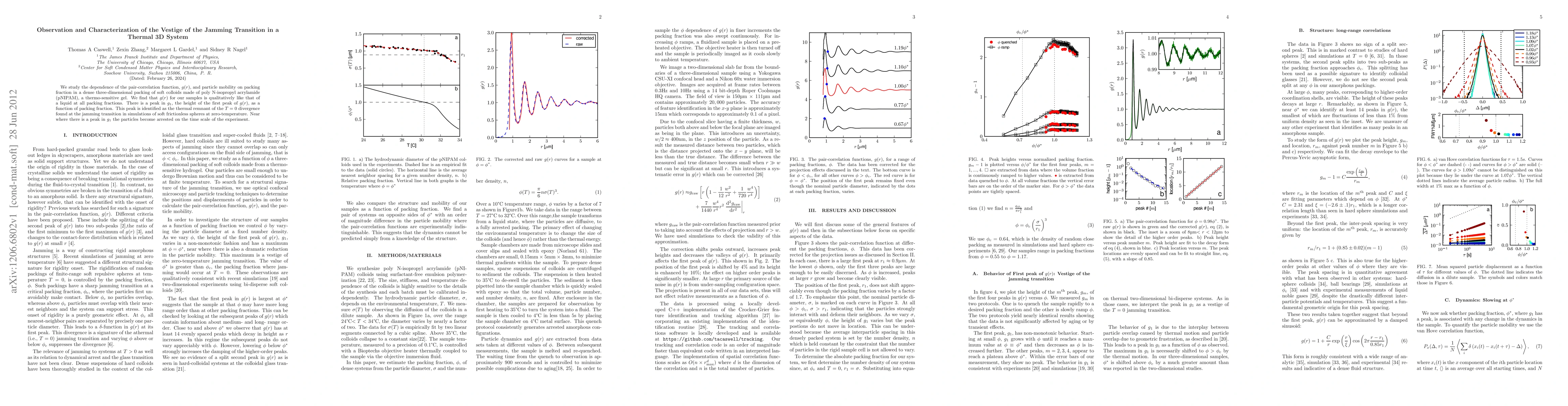We study the dependence of the pair-correlation function, $g(r)$, and particle mobility on packing fraction in a dense three-dimensional packing of soft colloids made of poly N-isopropyl acrylamide (pNIPAM), a thermo-sensitive gel. We find that $g(r)$ for our samples is qualitatively like that of a liquid at all packing fractions. There is a peak in $g_{1}$, the height of the first peak of $g(r)$, as a function of packing fraction. This peak is identified as the thermal remnant of the T=0 divergence found at the jamming transition in simulations of soft frictionless spheres at zero-temperature. Near where there is a peak in $g_{1}$ the particles become arrested on the time scale of the experiment.