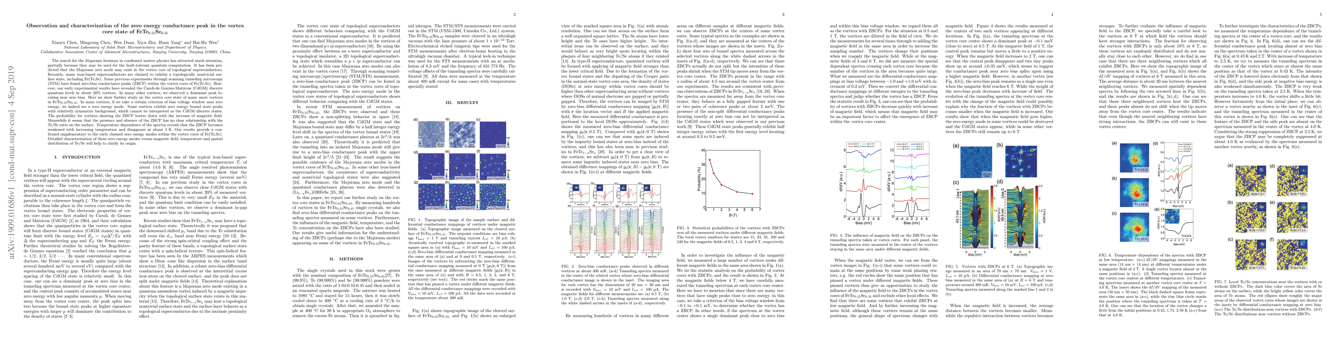 This paper investigates the zero-bias conductance peaks (ZBCP) in the vortex core state of FeTe$_{0.55}$Se$_{0.45}$, suggesting the potential existence of Majorana zero modes. The study finds that the probability of observing ZBCP decreases with higher magnetic fields and diminishes with increasing temperature, providing further evidence for the presence of zero energy modes in these topological superconductors.