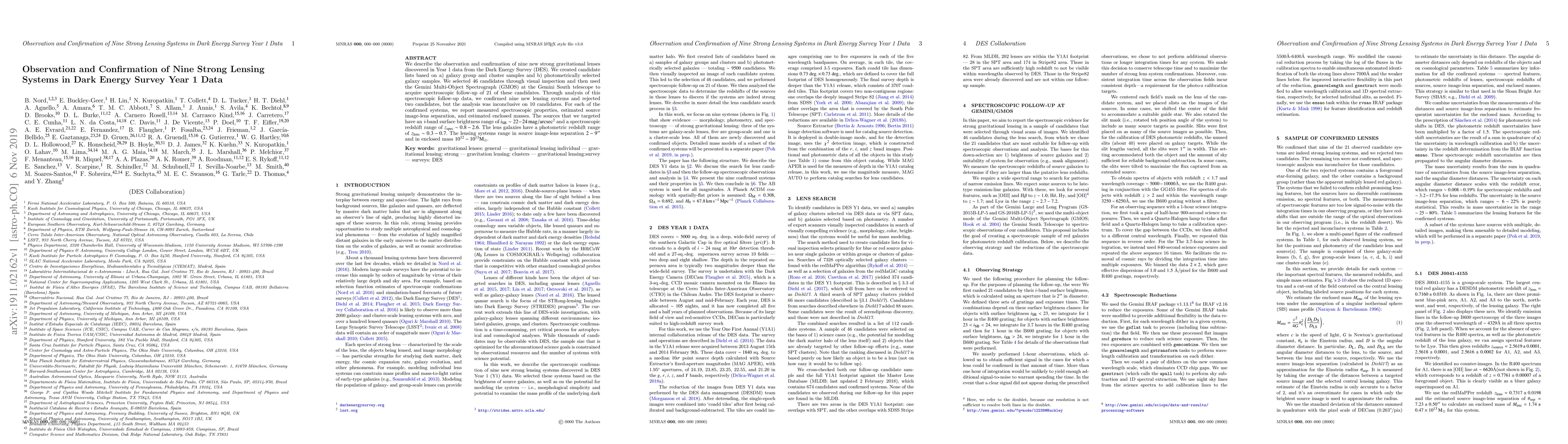 This study confirms nine new strong lensing systems identified in the Dark Energy Survey Year 1 data, utilizing galaxy group and cluster samples and photometrically selected galaxies. Spectroscopic follow-up with the Gemini Multi-Object Spectrograph confirmed the systems, providing detailed properties and mass estimates.