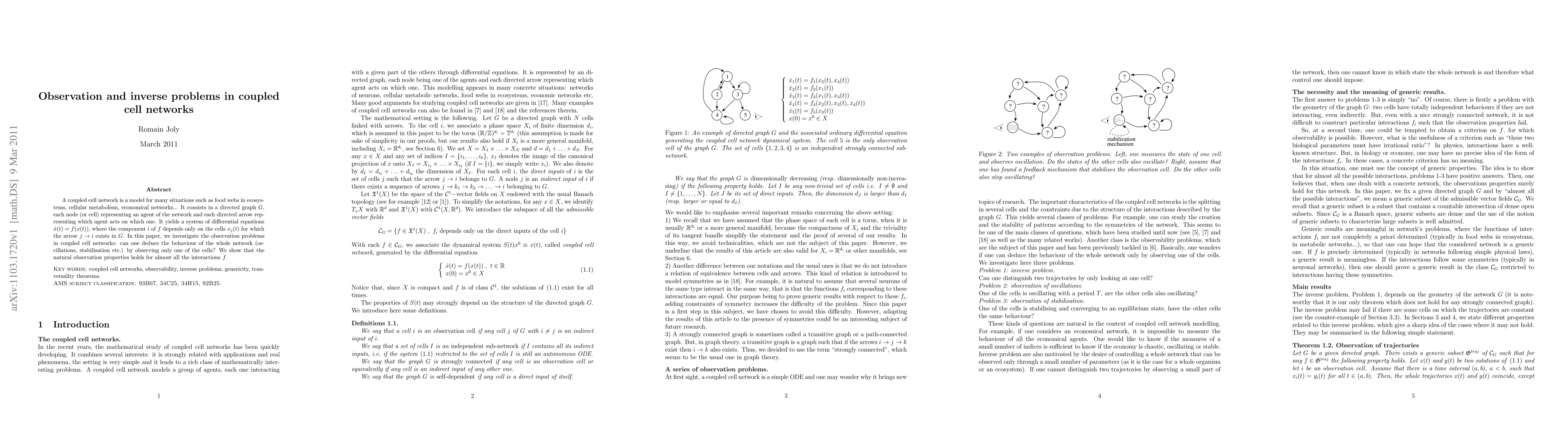 A coupled cell network is a model for many situations such as food webs in ecosystems, cellular metabolism, economical networks... It consists in a directed graph $G$, each node (or cell) representing an agent of the network and each directed arrow representing which agent acts on which one. It yields a system of differential equations $\dot x(t)=f(x(t))$, where the component $i$ of $f$ depends only on the cells $x_j(t)$ for which the arrow $j\rightarrow i$ exists in $G$. In this paper, we investigate the observation problems in coupled cell networks: can one deduce the behaviour of the whole network (oscillations, stabilisation etc.) by observing only one of the cells? We show that the natural observation properties holds for almost all the interactions $f$.